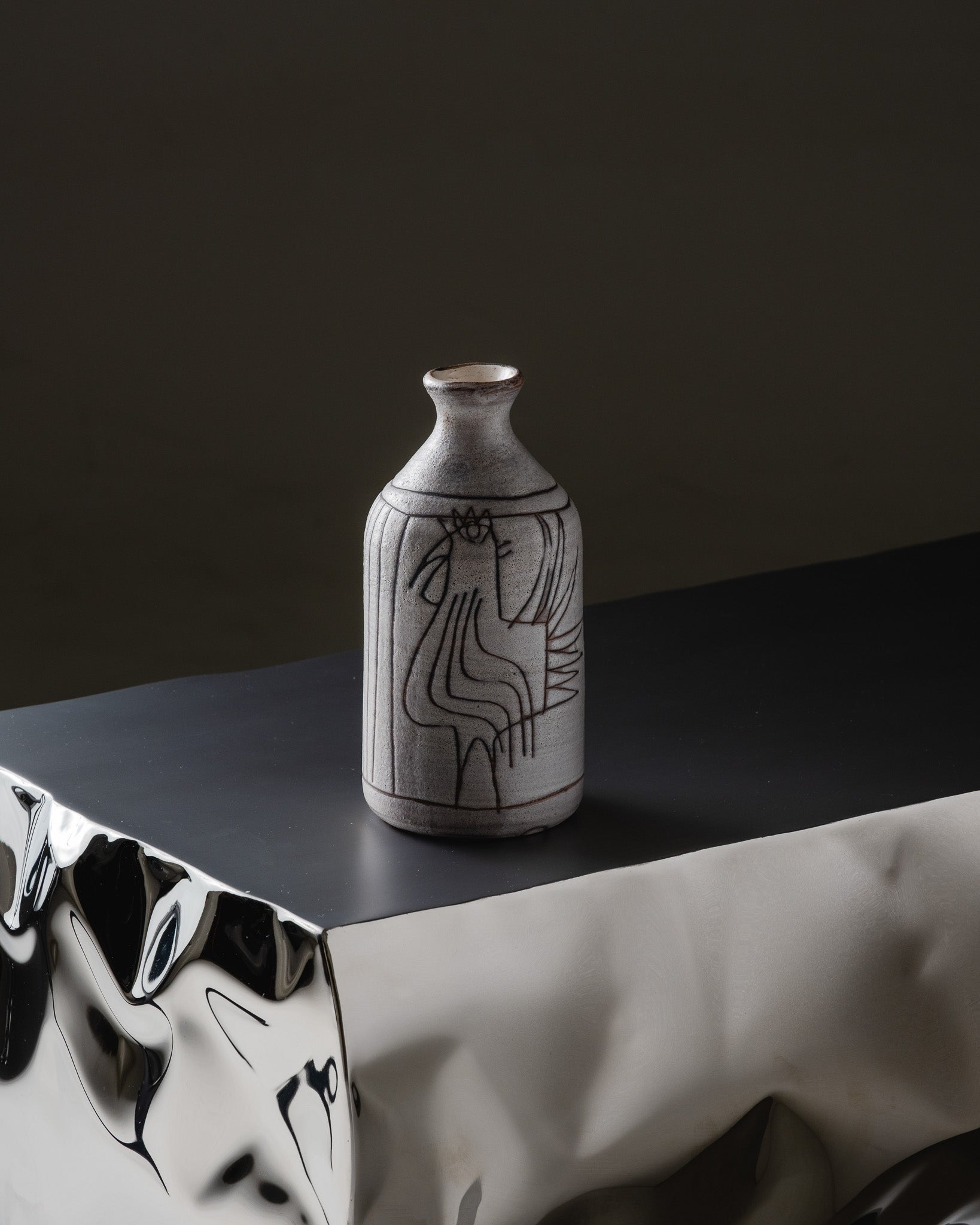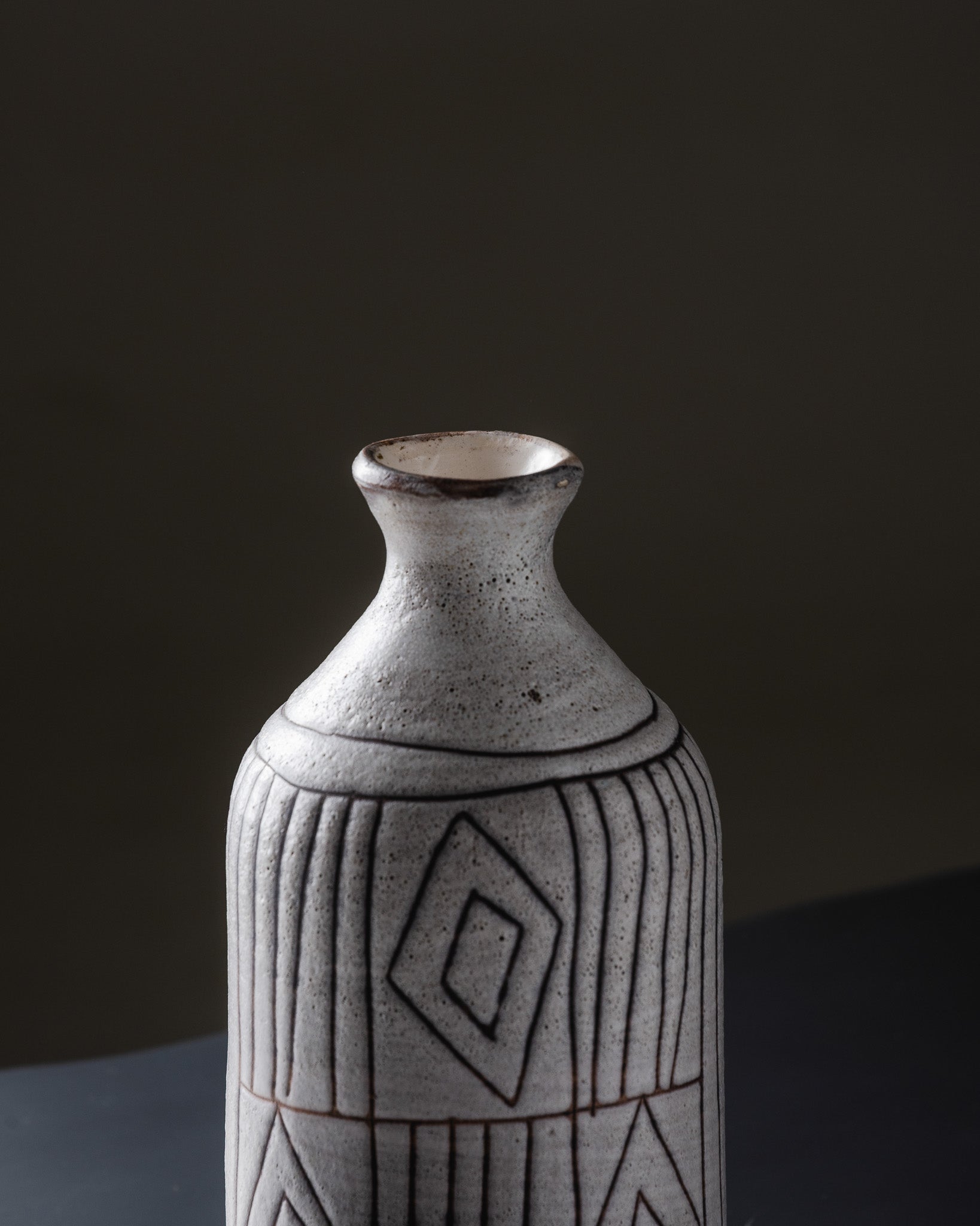 Soliflore en grès chamotté à engobe beige clair, décor gravé au trait brun représentant un coq stylisé et des motifs géométriques. Surface mate légèrement texturée, intérieur émaillé transparent. Signature incisée L’Atelier Dieulefit sous la base. Travail français, années 1950-60. Très bel état.