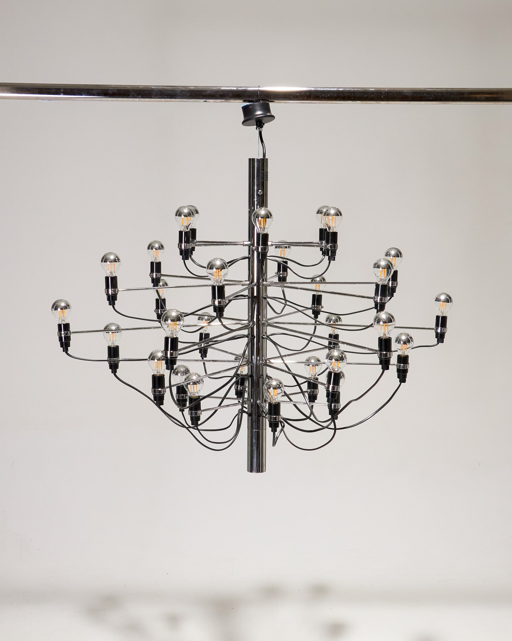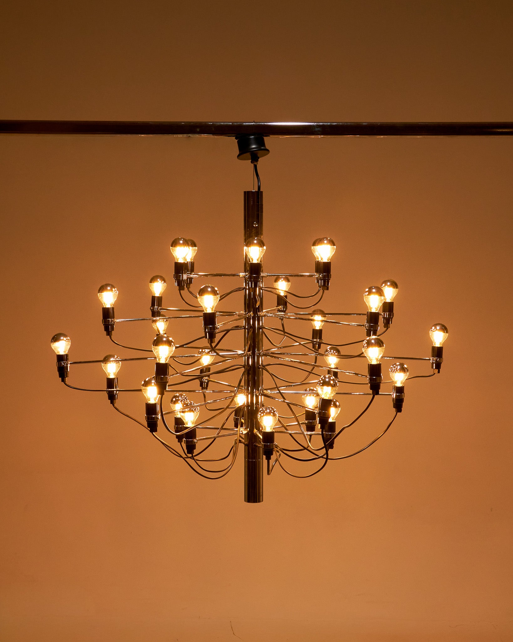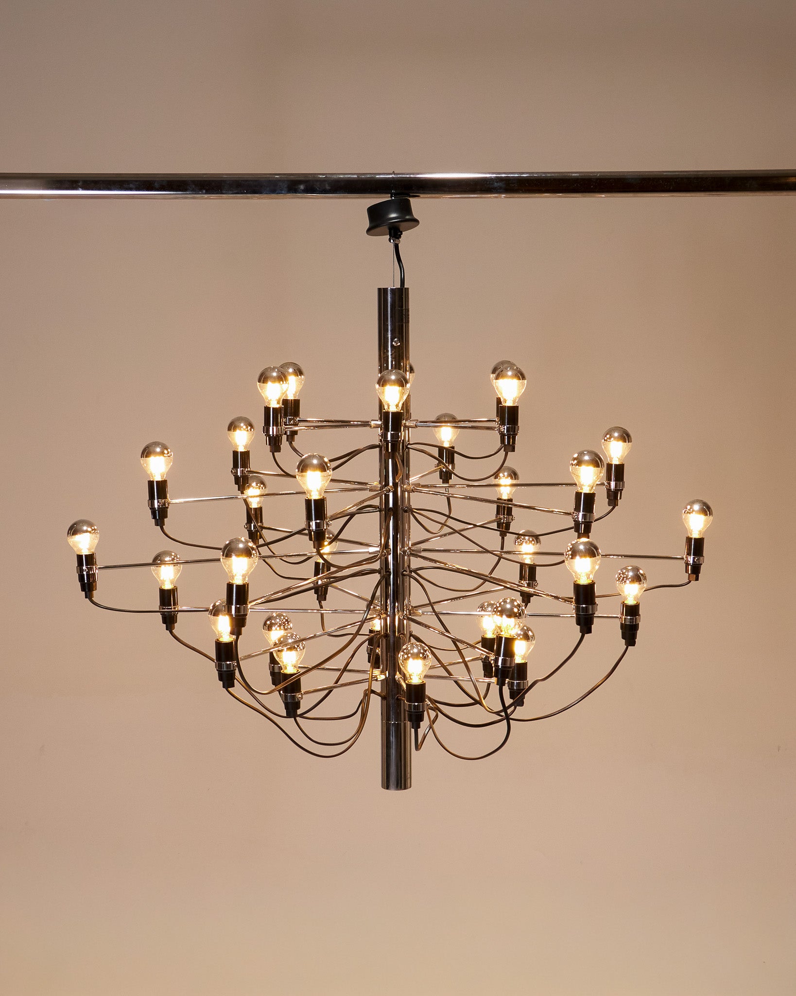 Suspension modèle "2097", conçu en 1958 par le designer italien Gino Sarfatti pour Flos. Emblématique des années 1960, cette pièce se distingue par sa structure en métal chromé et sa configuration de trente ampoules, offrant une lumière indirecte et une esthétique "araignée" grâce à ses bras multiples et ses câbles décoratifs. Elle est équipée d'une tige métallique centrale et de plusieurs branches. La hauteur est réglable afin de s'adapter à divers espaces.