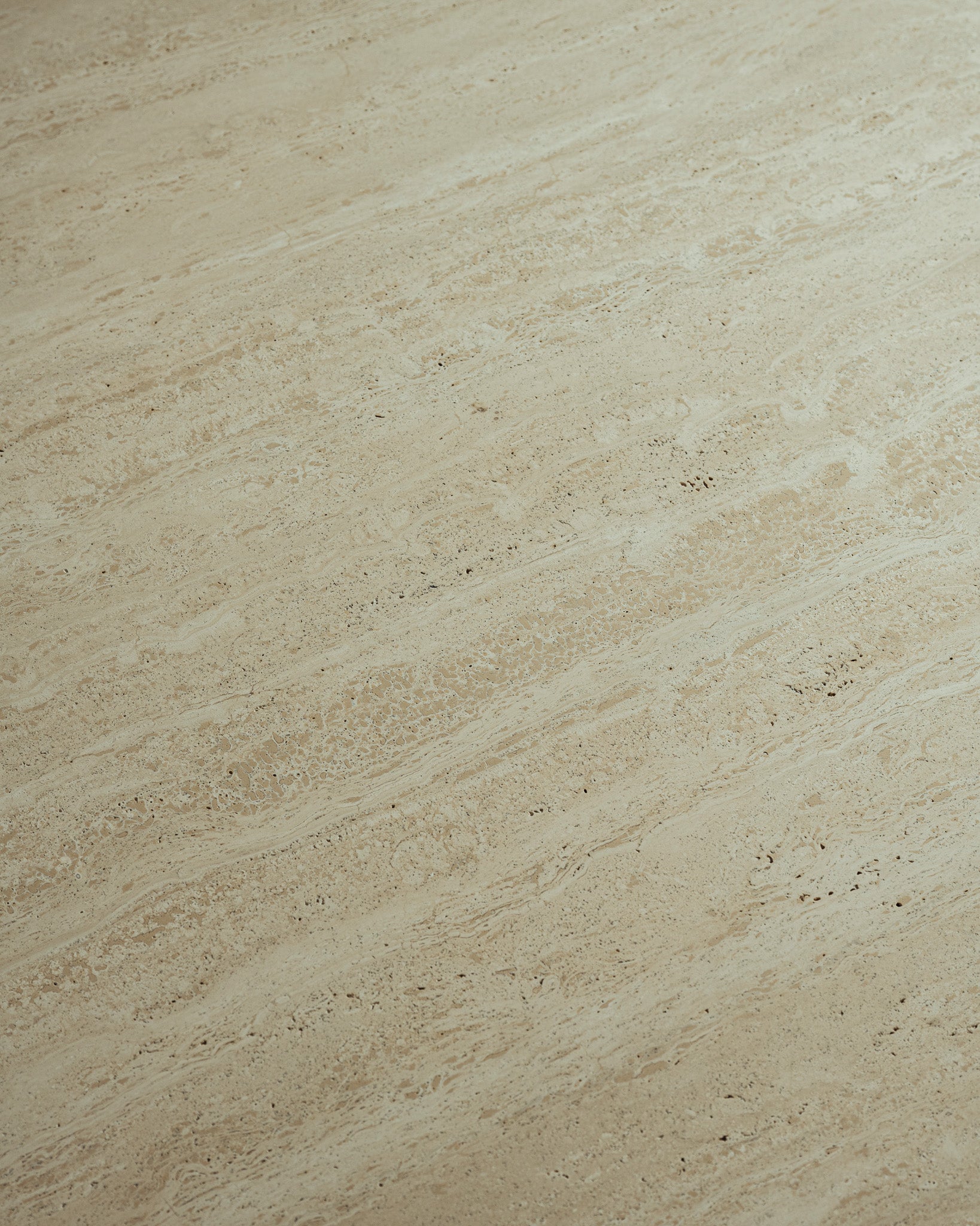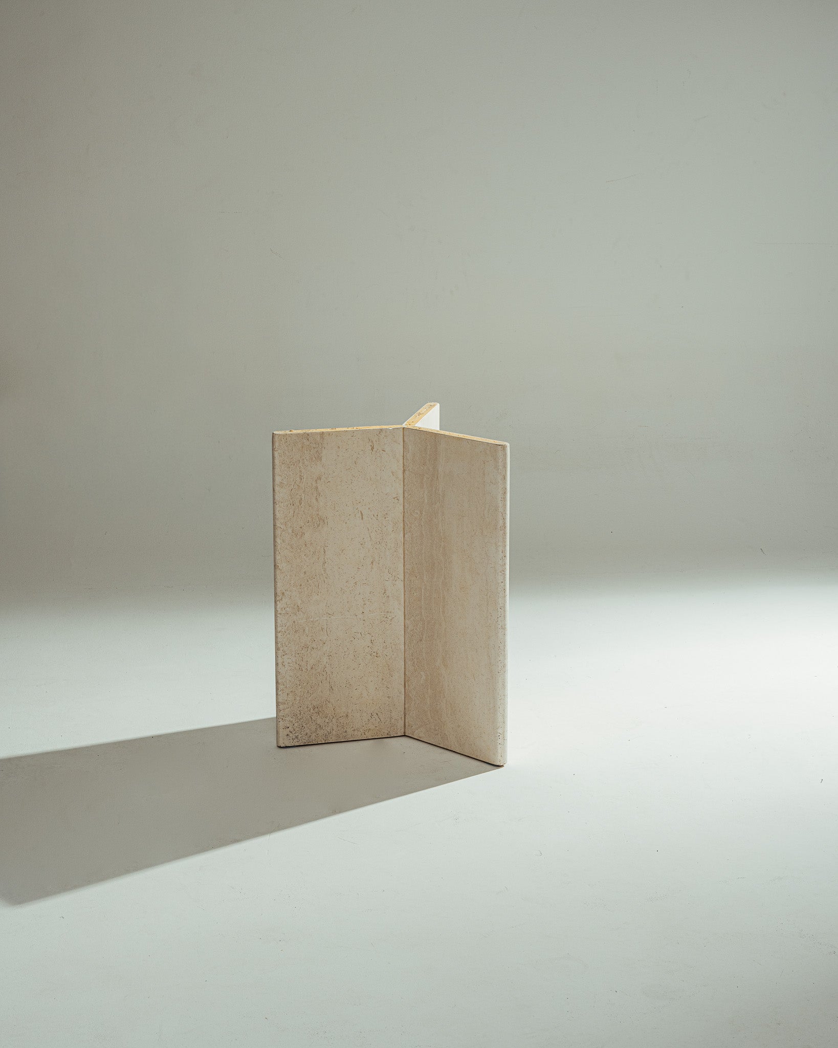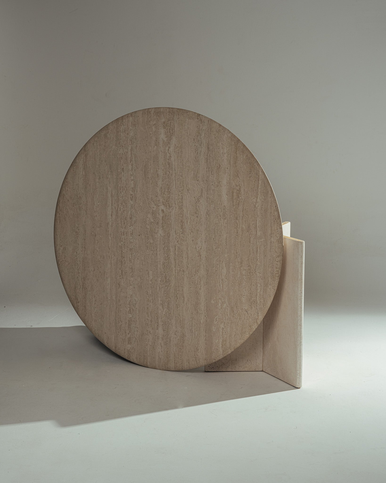 Table à manger ronde en travertin, années 1980. Plateau rond en travertin beige reposant sur un piètement central composé de panneaux croisés. L'ensemble peut être désolidarisé du pied afin de faciliter son transport.