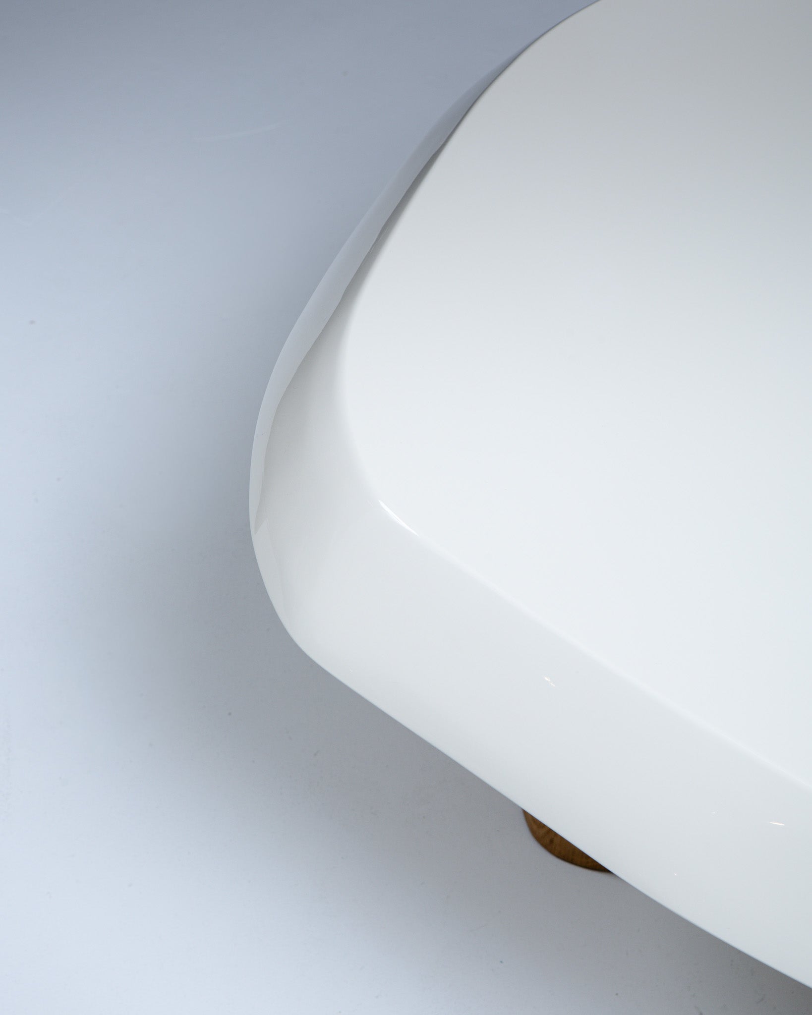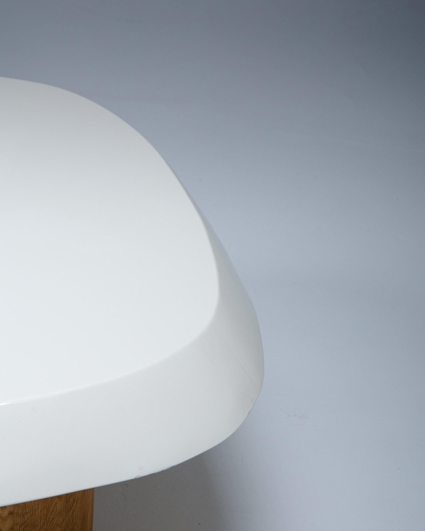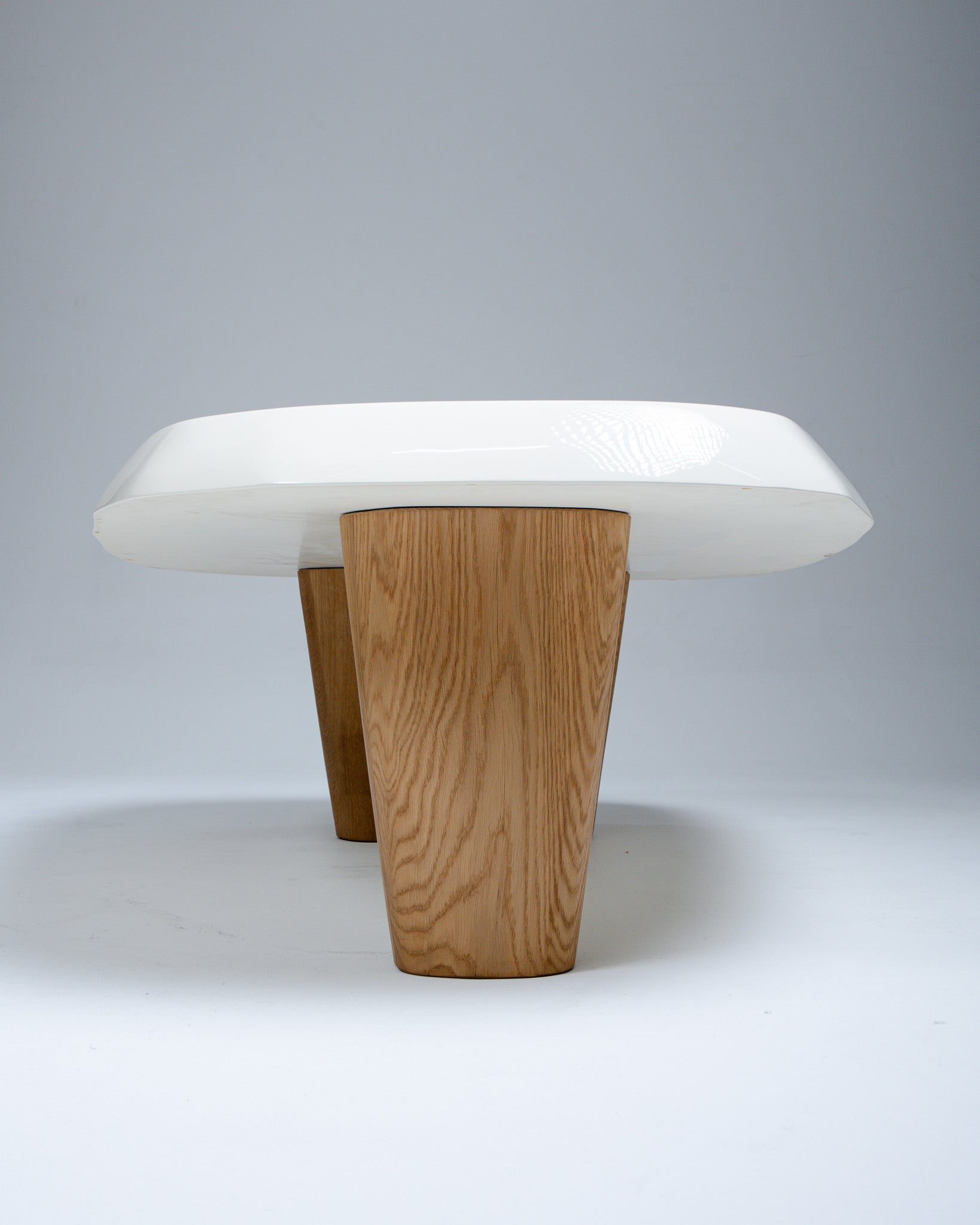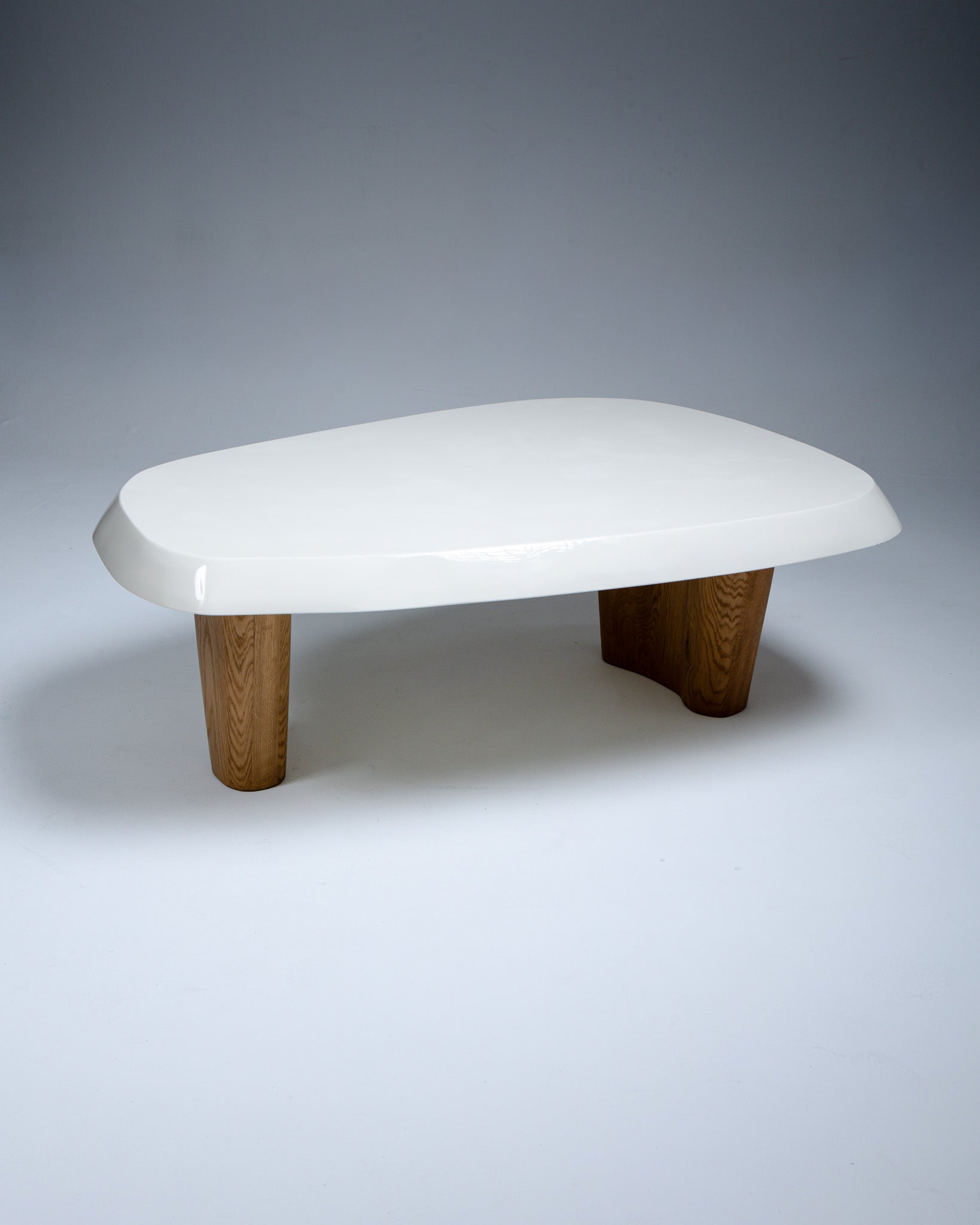 Table basse, Pierre Augustin Rose, aux formes libres, pensée comme une véritable sculpture fonctionnelle. Le plateau repose sur deux pieds en chêne massif sculpté, créant un équilibre entre forme et matière.