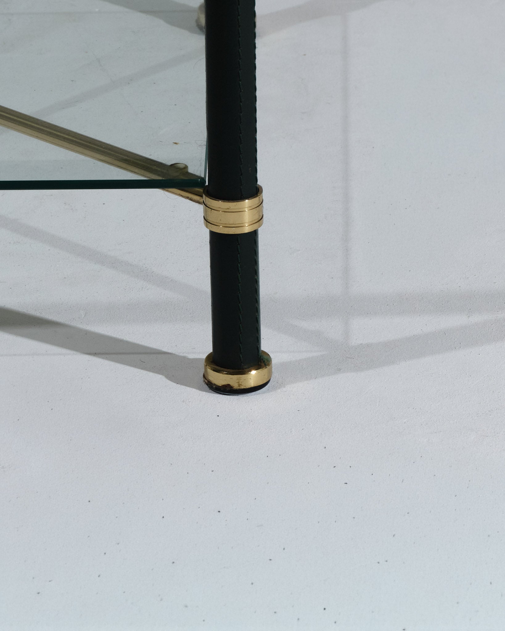 Table basse carrée dans le goût de Jacques Adnet. Travail des années 1950. Structure en laiton gainée de cuir vert foncé à couture sellier, double plateau en verre clair et croisillons centraux en laiton. Parfait état.