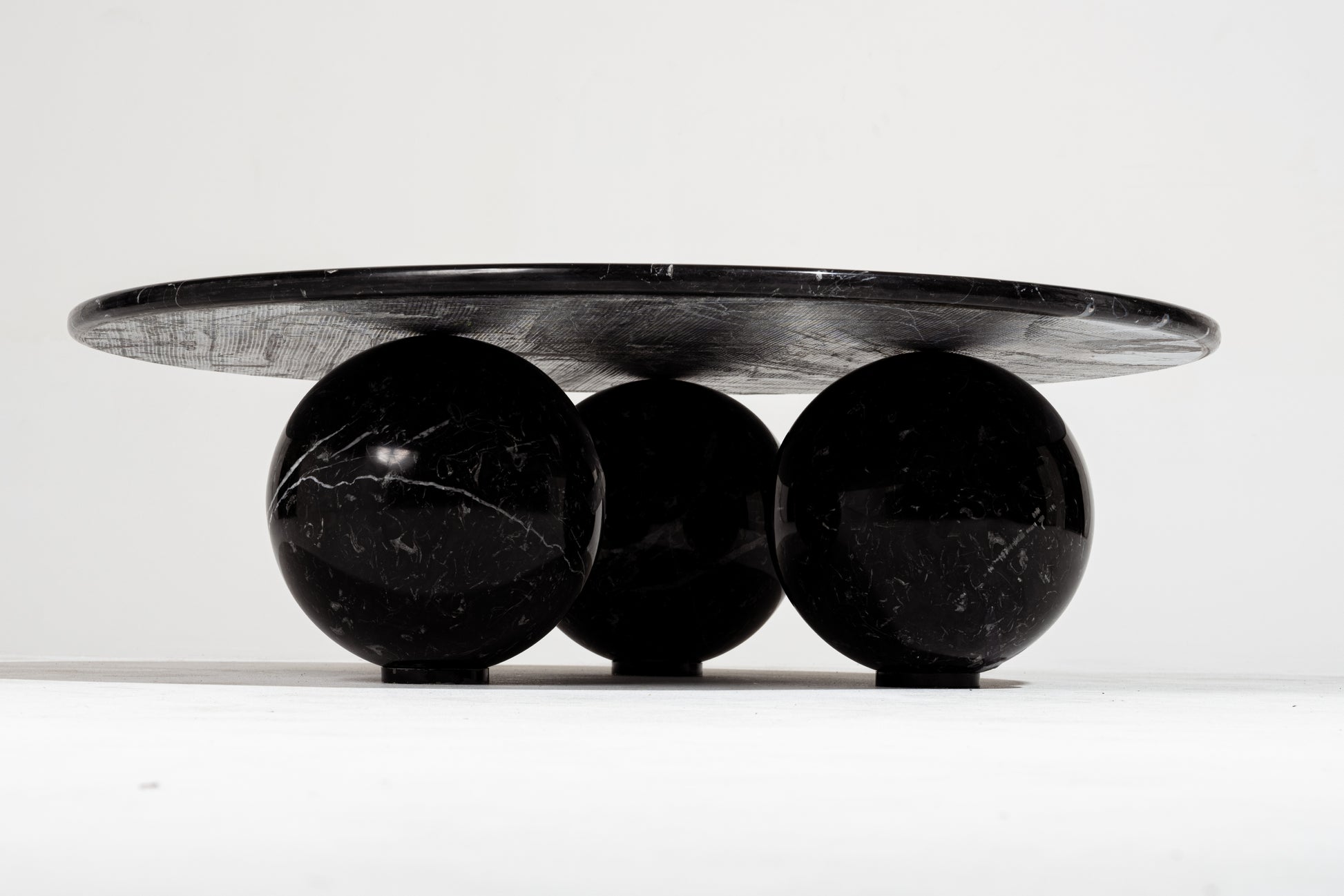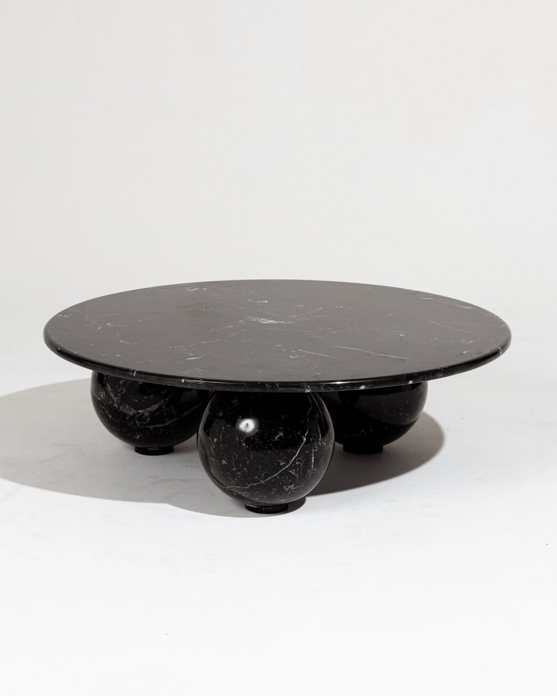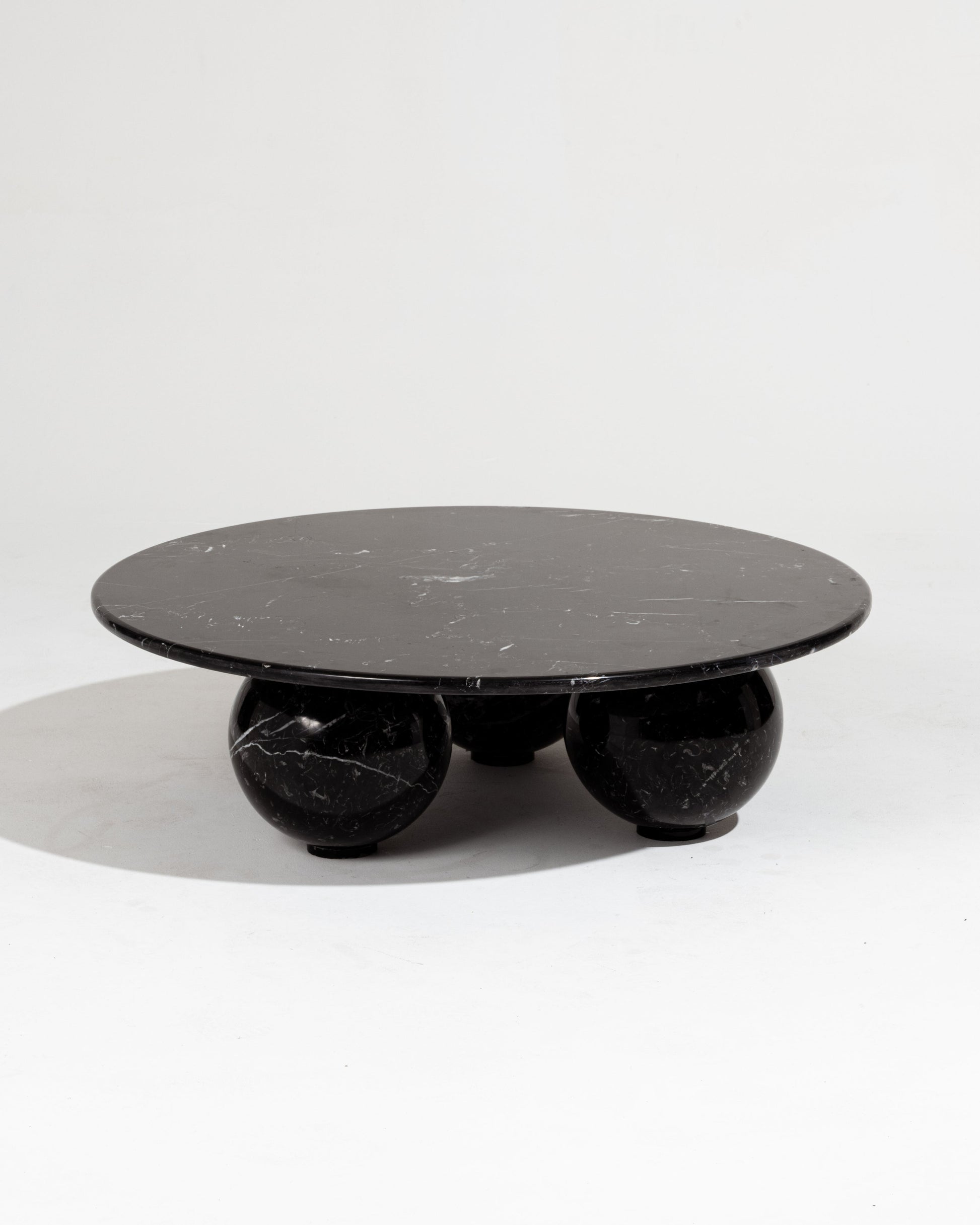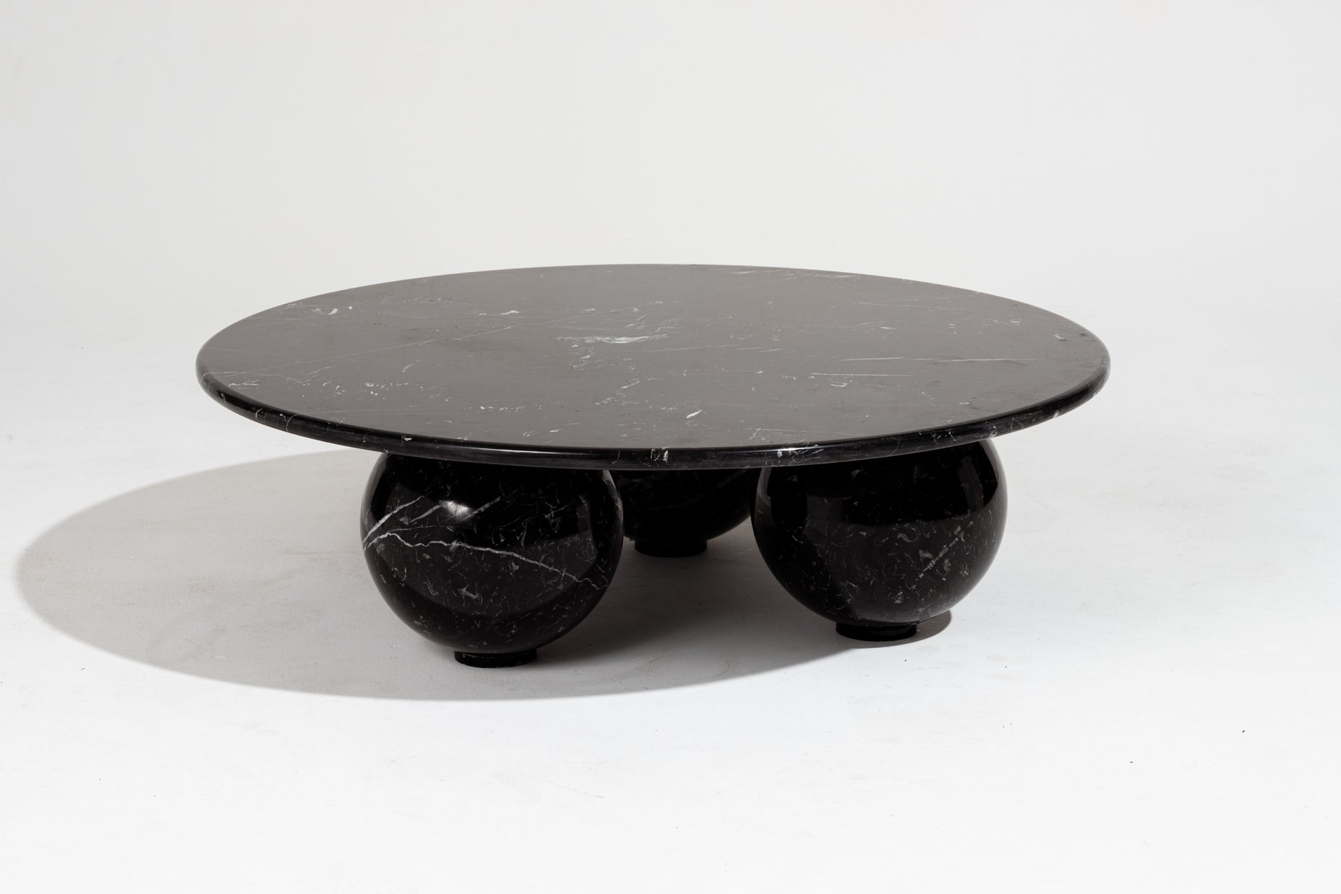 Table basse ronde à pieds sphériques en marbre noir. Le plateau repose librement sur trois sphères indépendantes, stabilisées par de discrets patins.