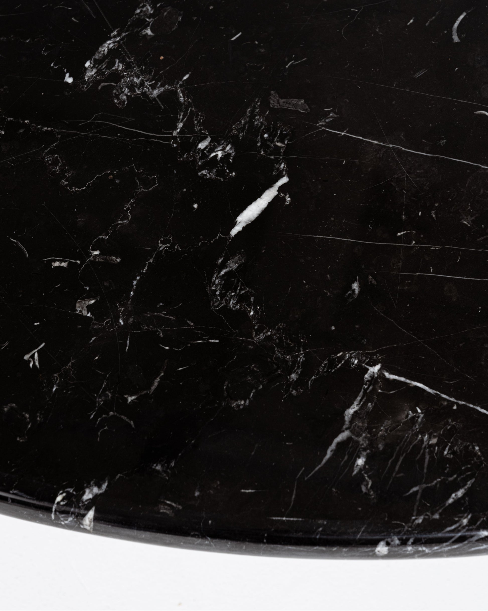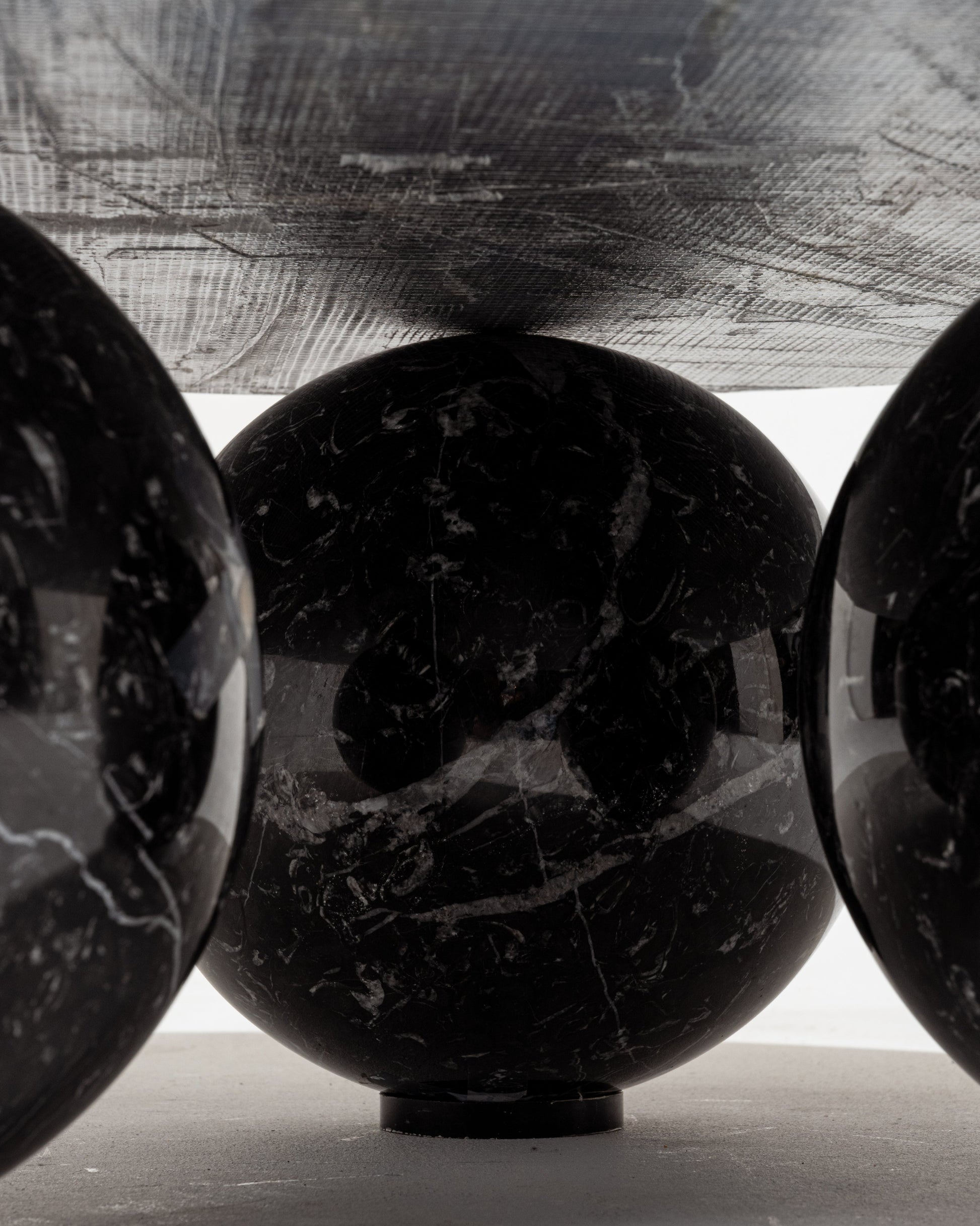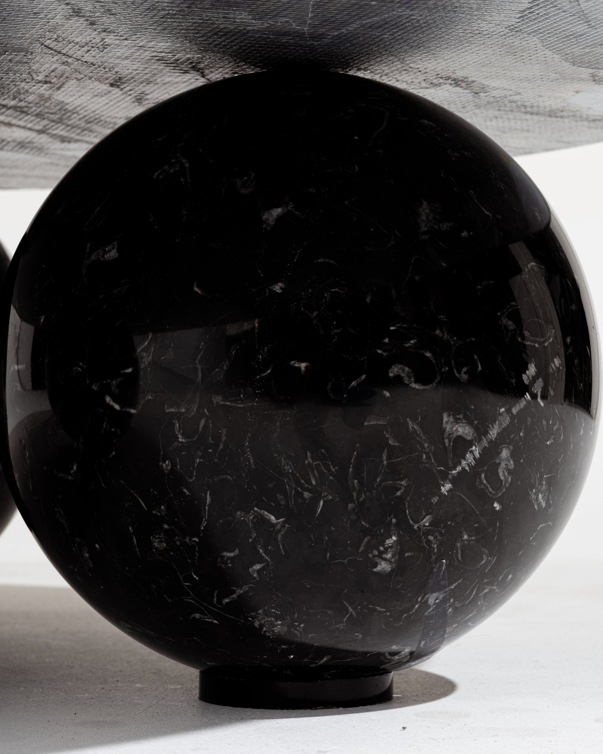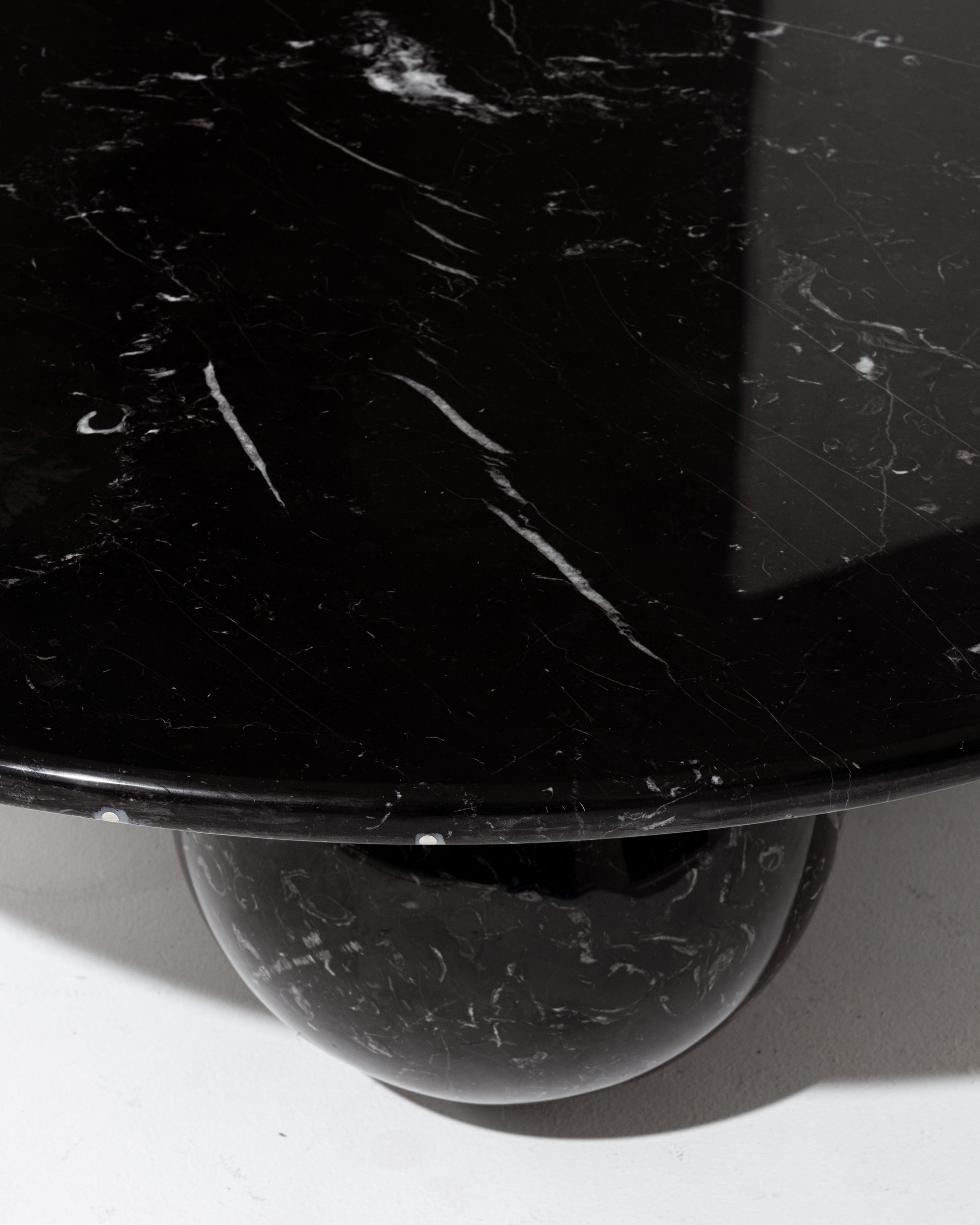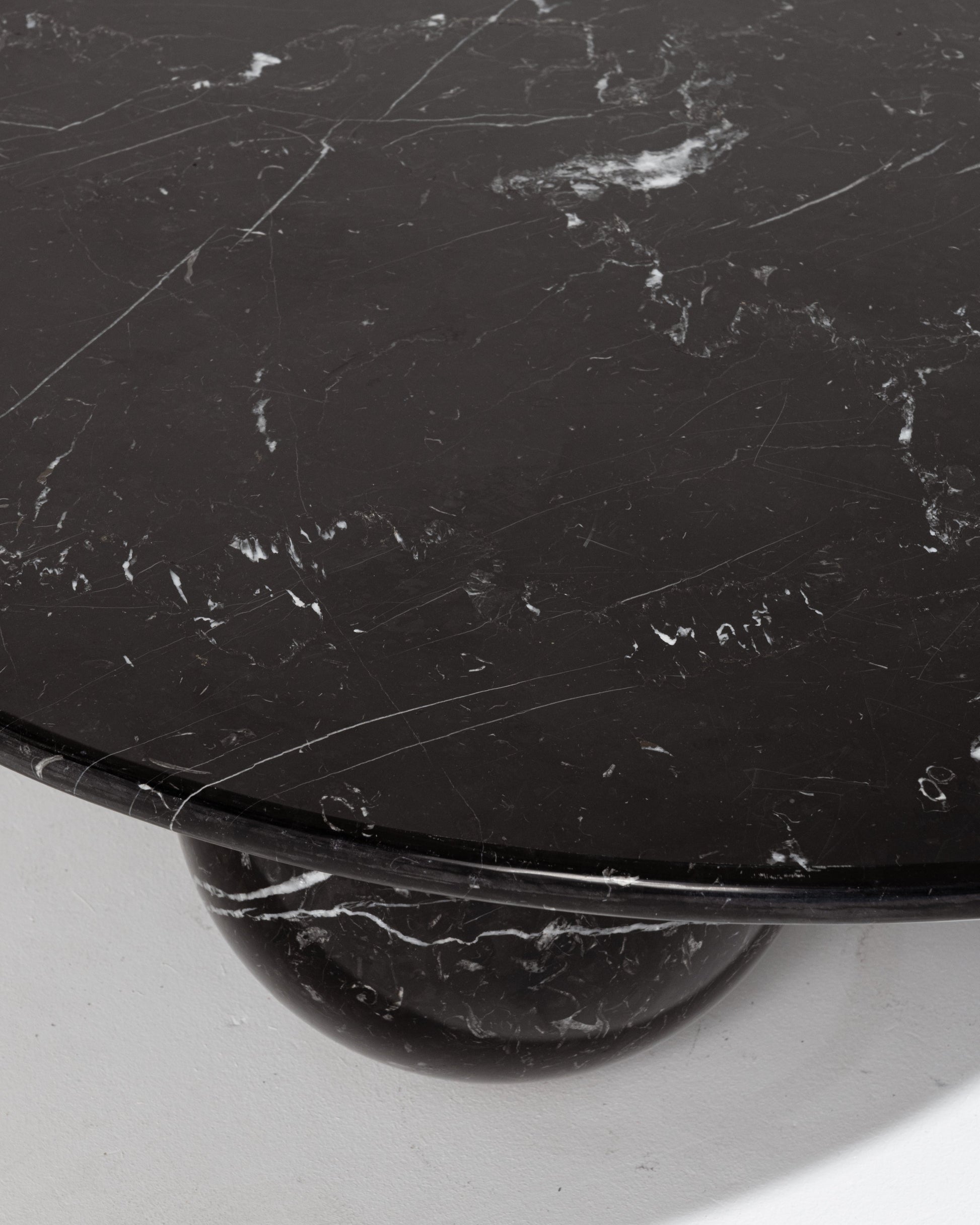 Table basse ronde à pieds sphériques en marbre noir. Le plateau repose librement sur trois sphères indépendantes, stabilisées par de discrets patins.