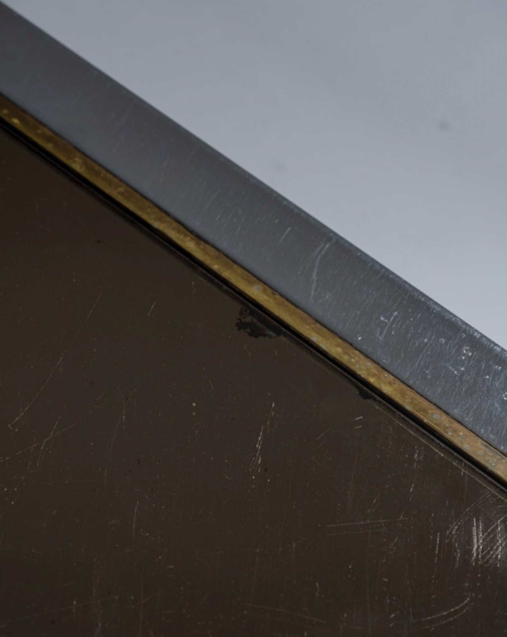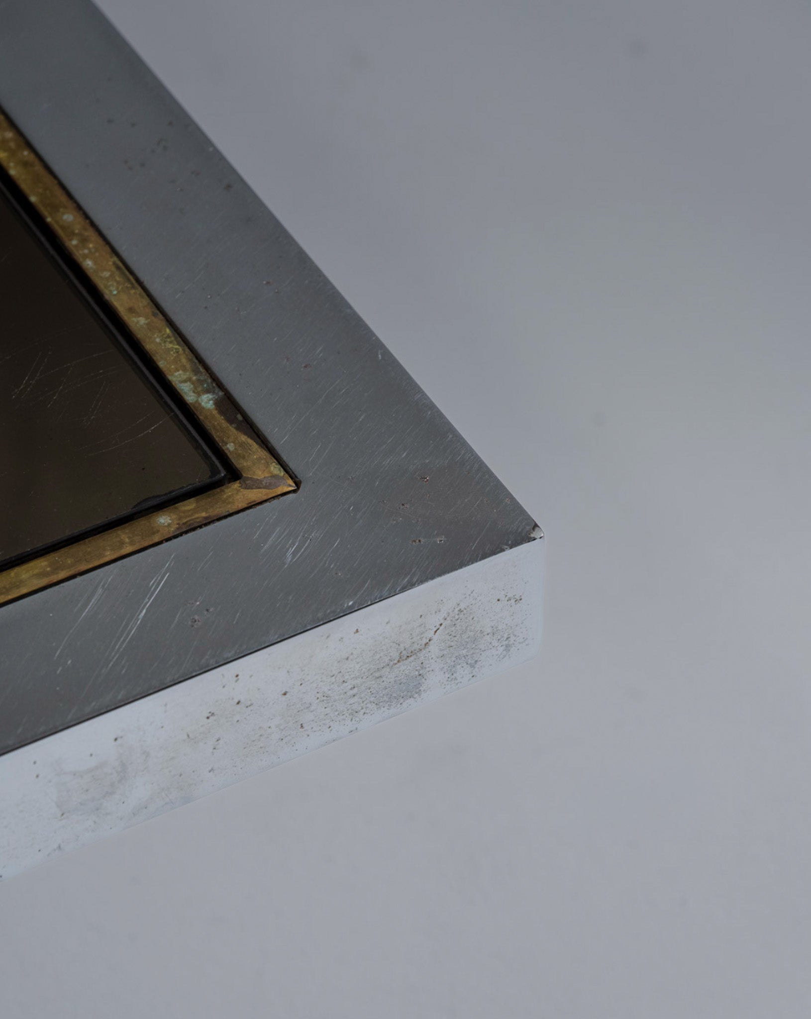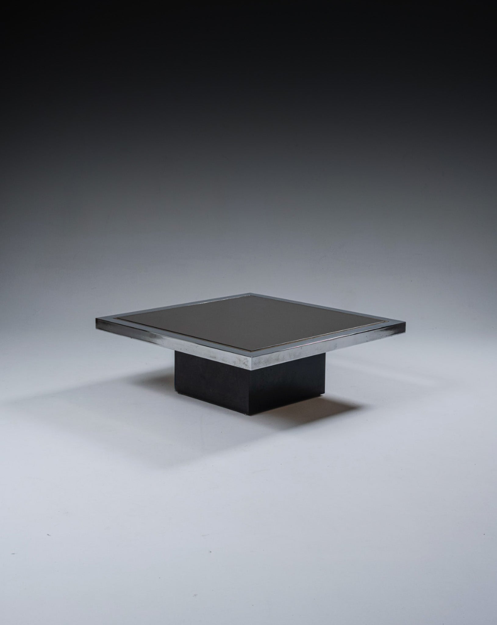 Table basse de forme carrée dans le goût de Willy Rizzo, composée d’un plateau en verre fumé encastré dans un cadre en métal. Reposant sur un piétement central cubique en bois noir, typique du design des années 1970.
