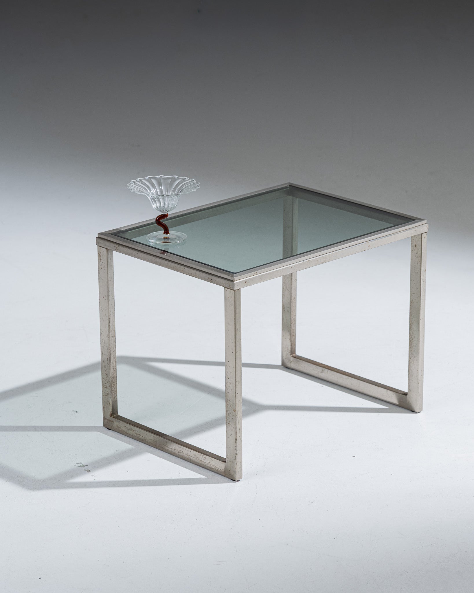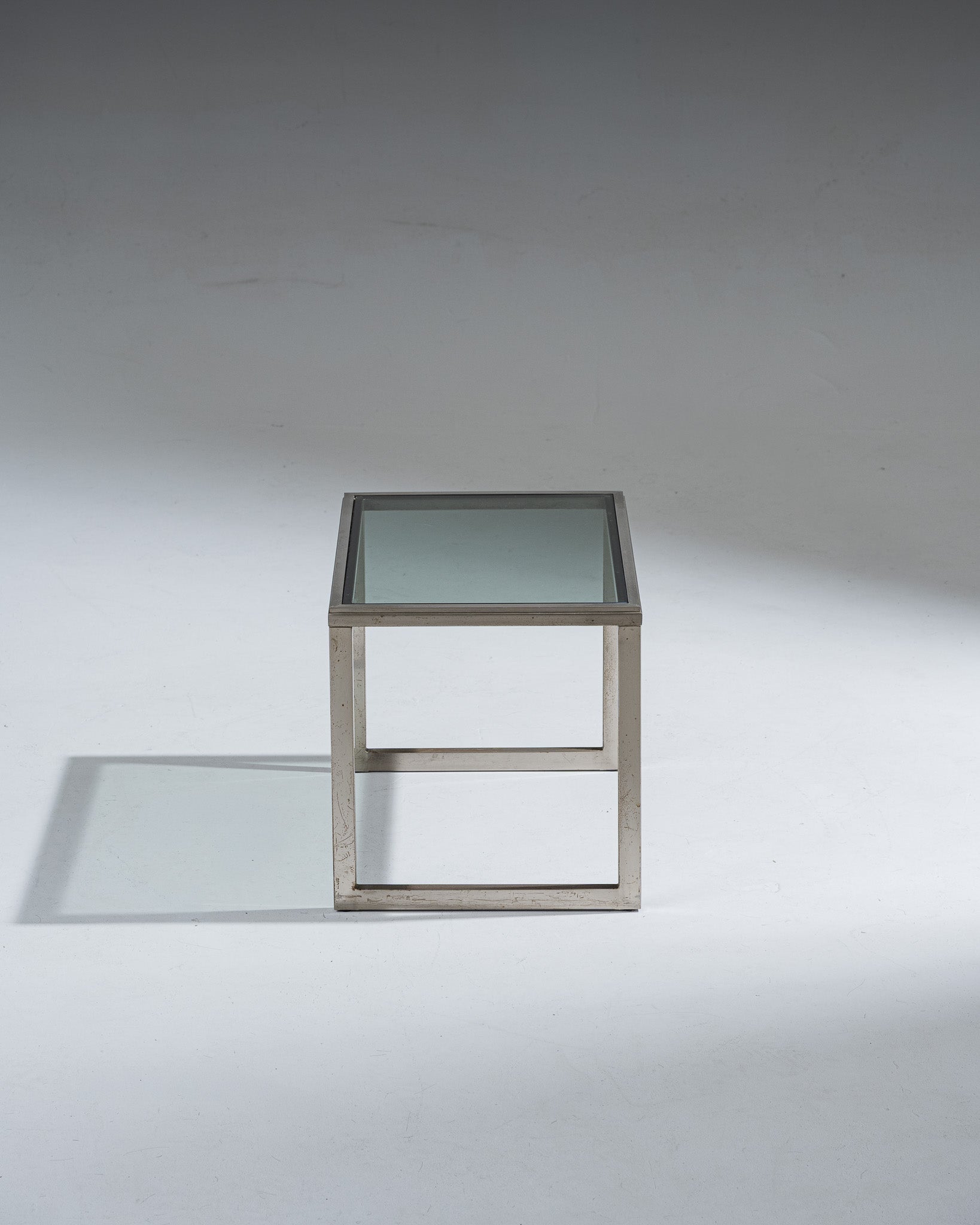 Petite table d'appoint rectangulaire en acier brossé et plateau en verre fumé. Bel état général, patine sur l'acier et marque d'usure.