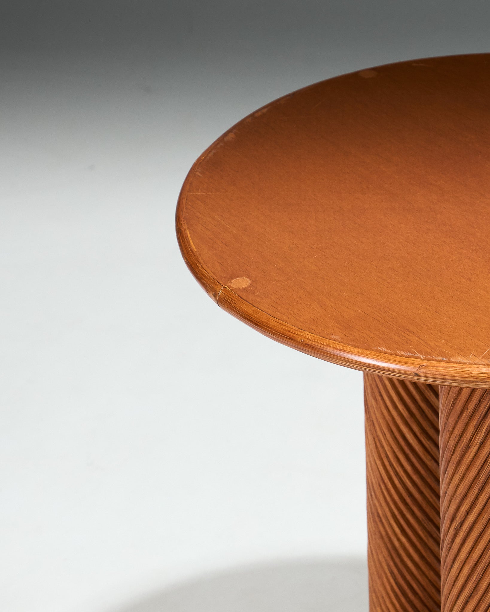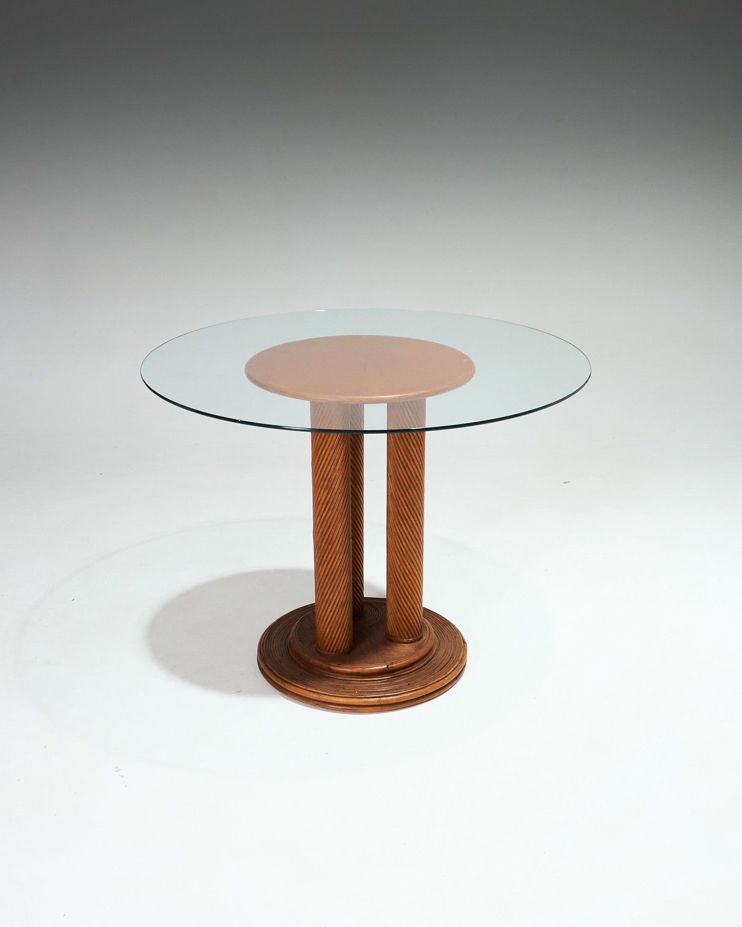 Table ronde dans le goût des créations de Maurizio Mariani et Giusto Purini pour Vivai del Sud, Italie. Modèle composé d’un plateau en verre reposant sur une structure en rotin, avec base circulaire et montants verticaux.