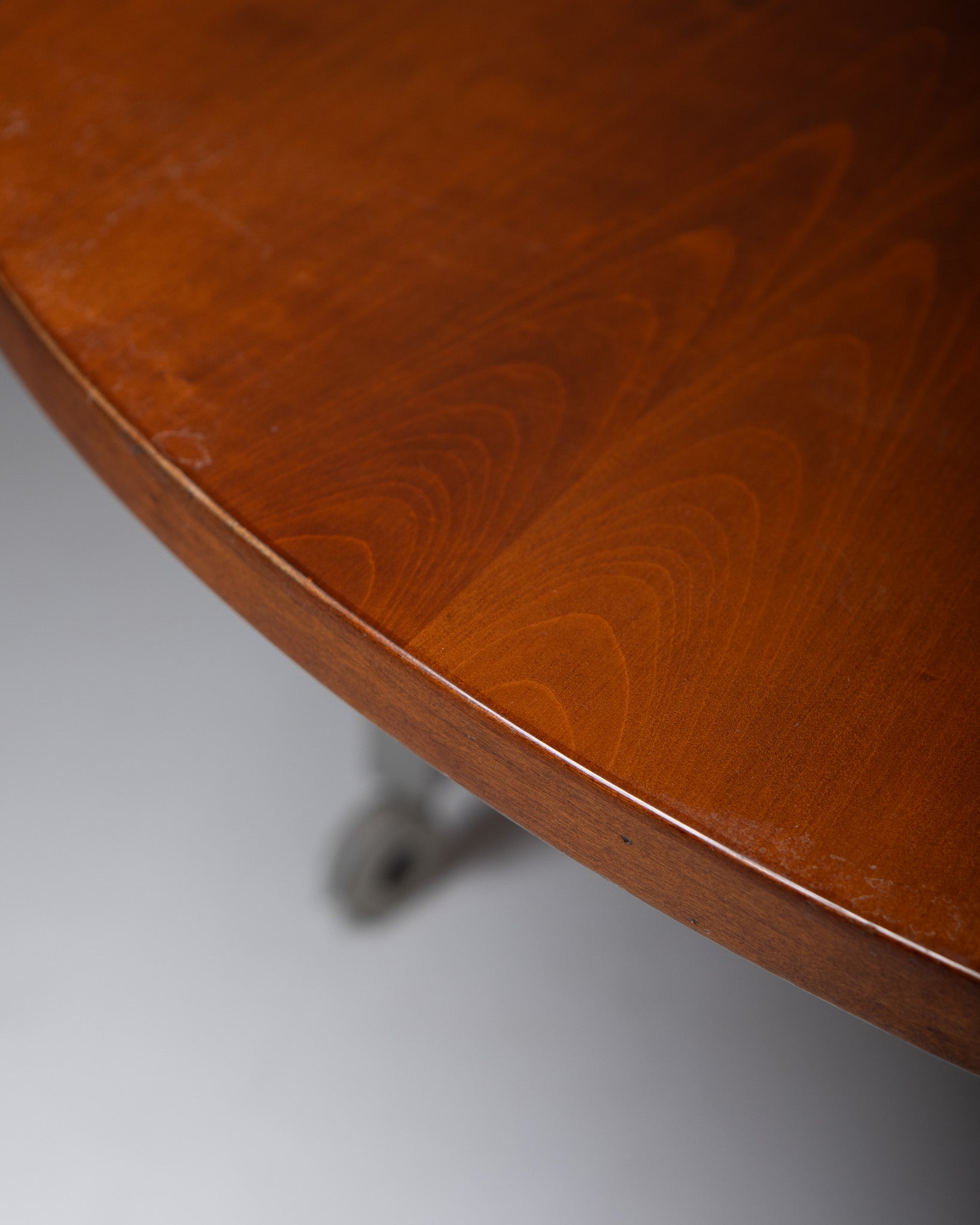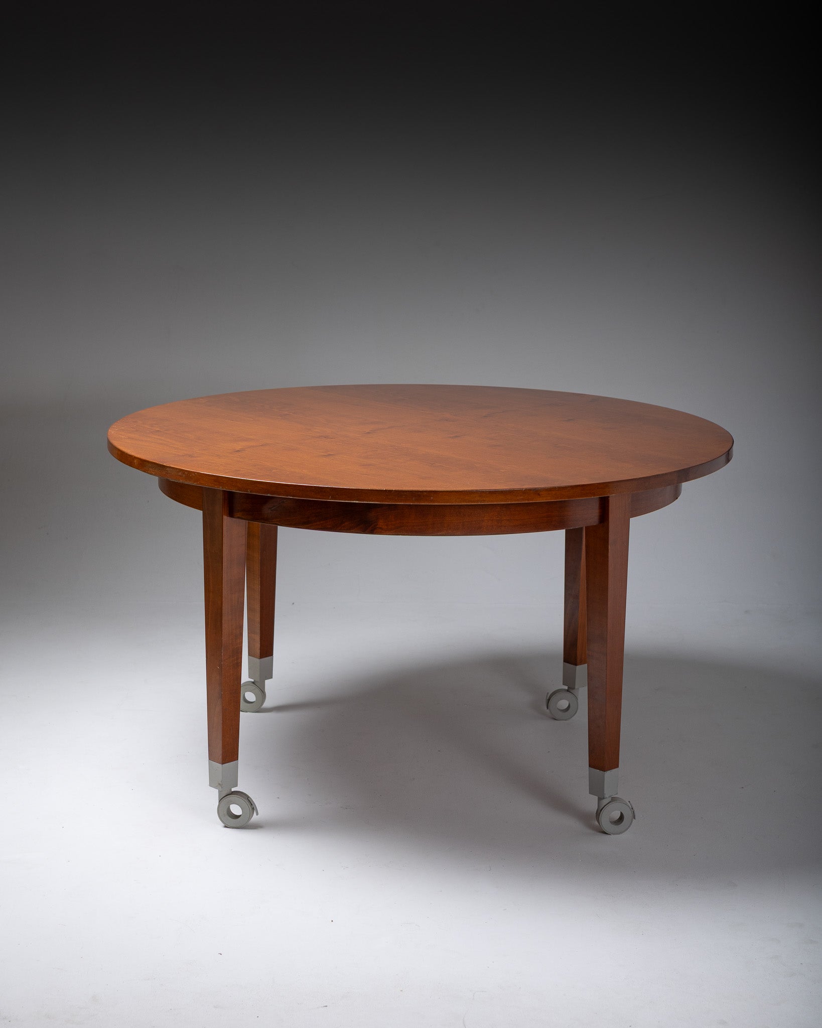 Table à manger modèle Neoz, dessinée par Philippe Starck pour Driade, années 1980. Elle présente un plateau circulaire en merisier laqué reposant sur un piétement composé de quatre pieds droits, chacun terminé par une roulette blanche. Bel état général, présentant quelques marques liées à l’âge et à l’usage.