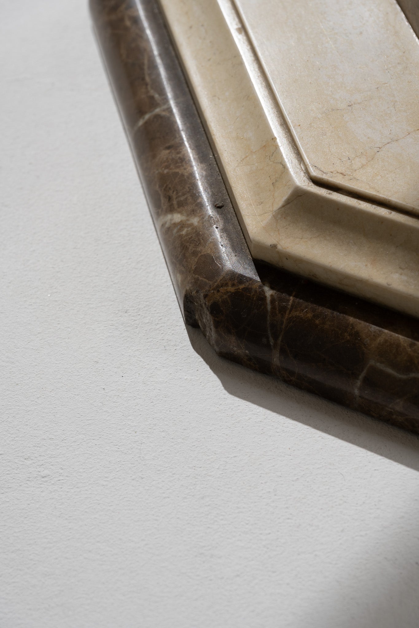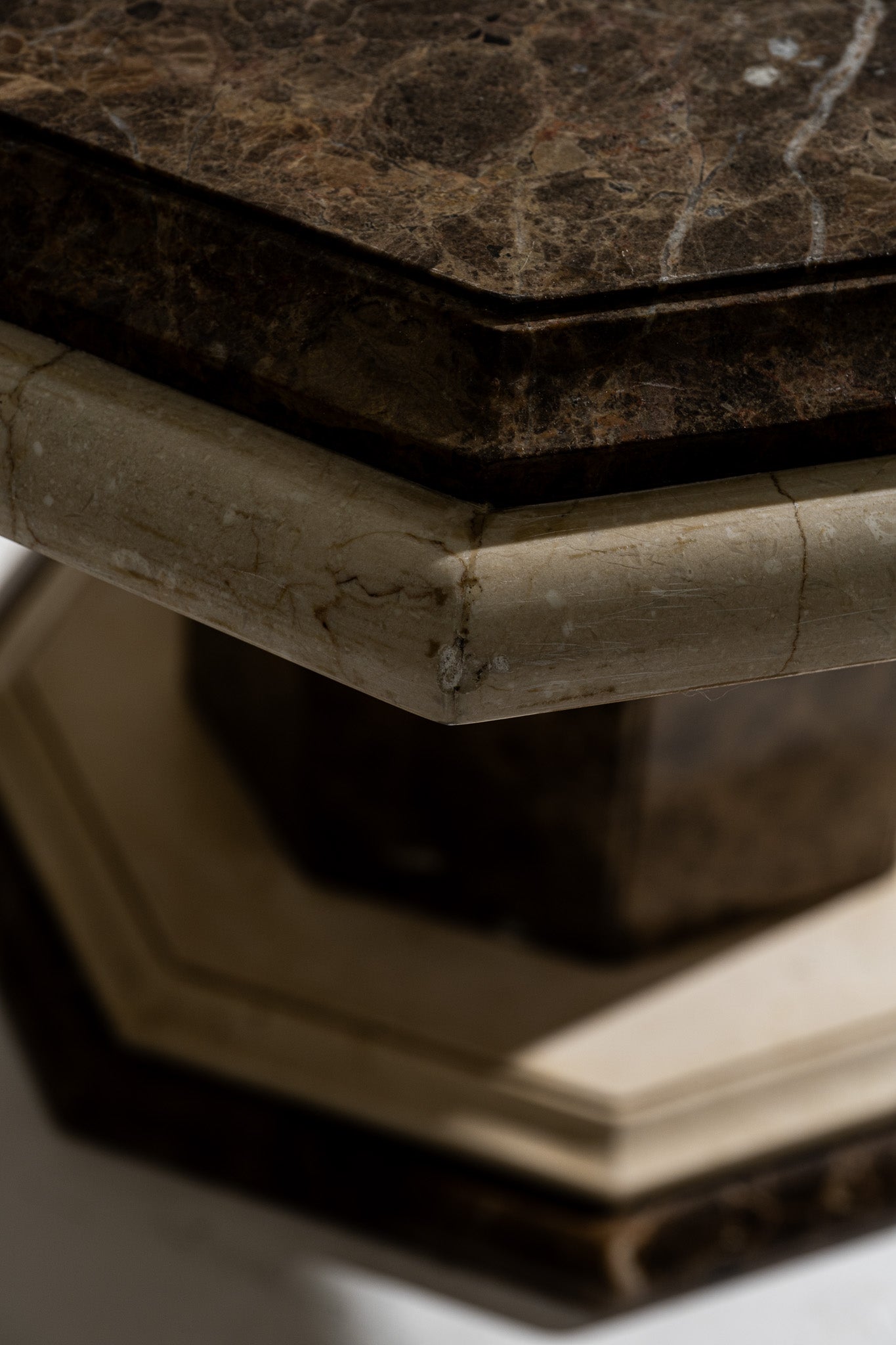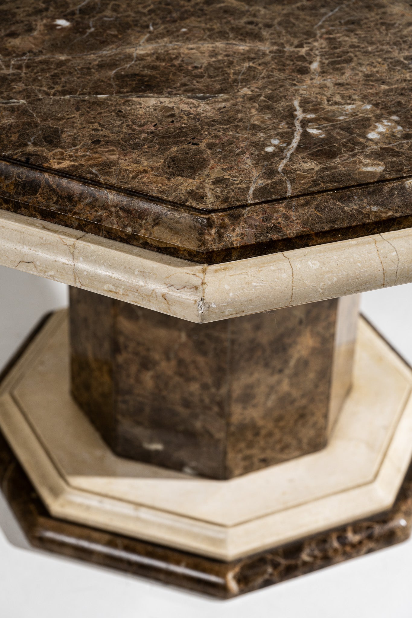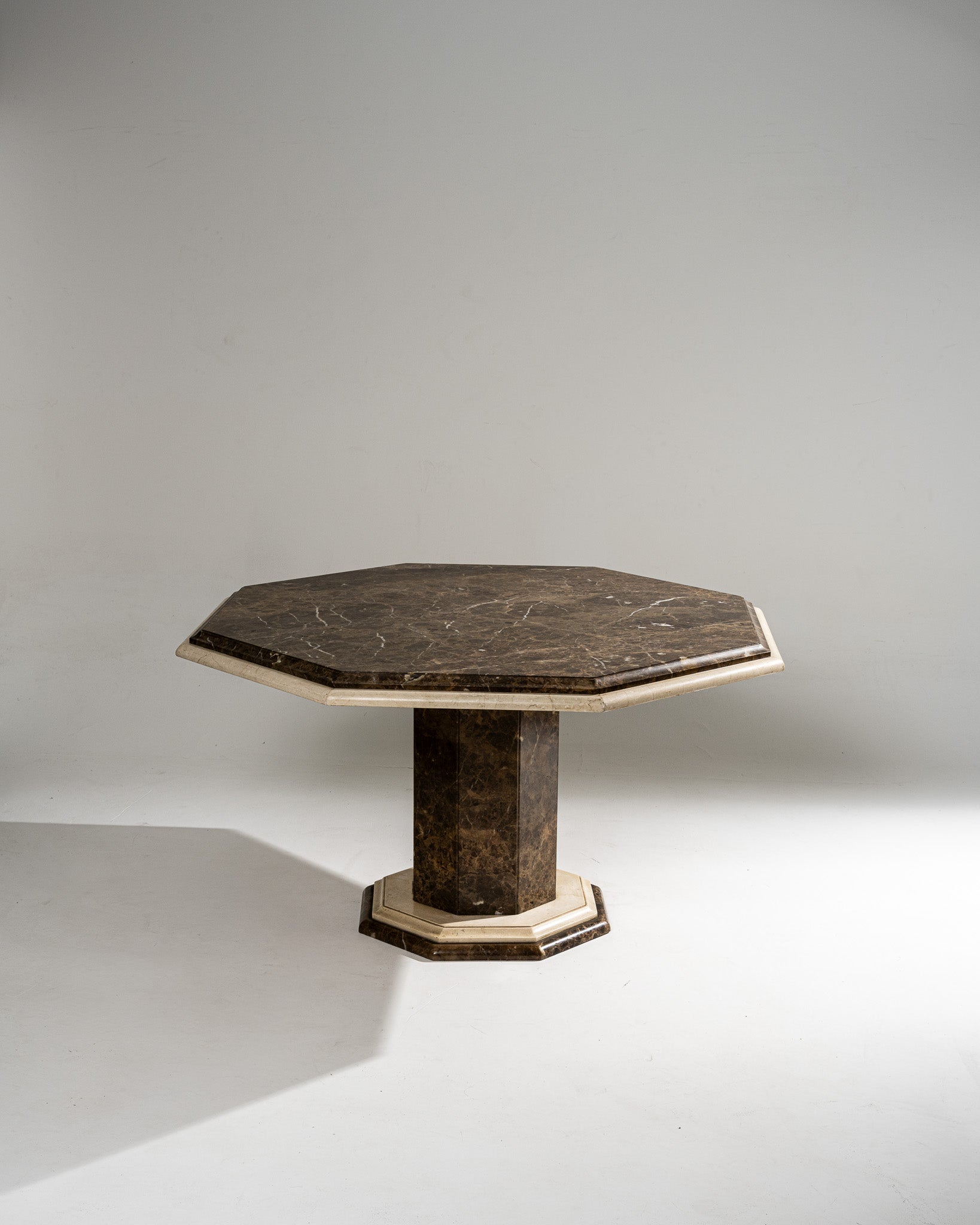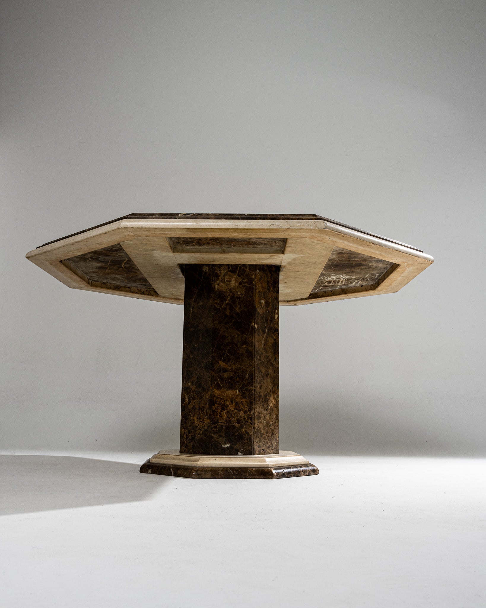 Table de salle à manger à plateau octogonal en marbre brun veiné, souligné d'un encadrement en marbre clair. Piétement central octogonal assorti, reposant sur une base à degrés en marbre clair. Travail italien, vers 1970. Bel état général. À noter, deux légers pocs visibles sur le plateau et le piètement (voir photos).