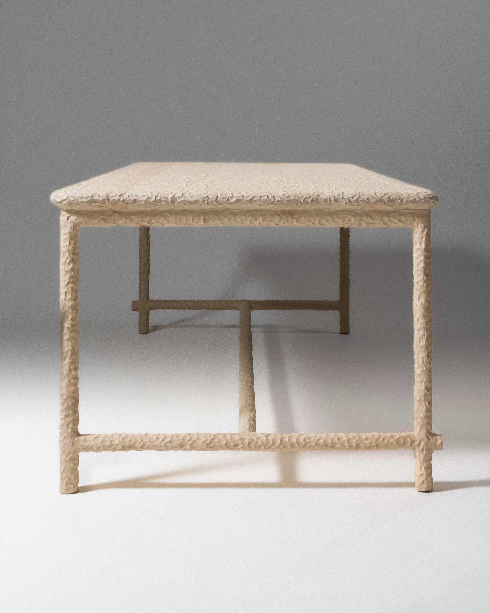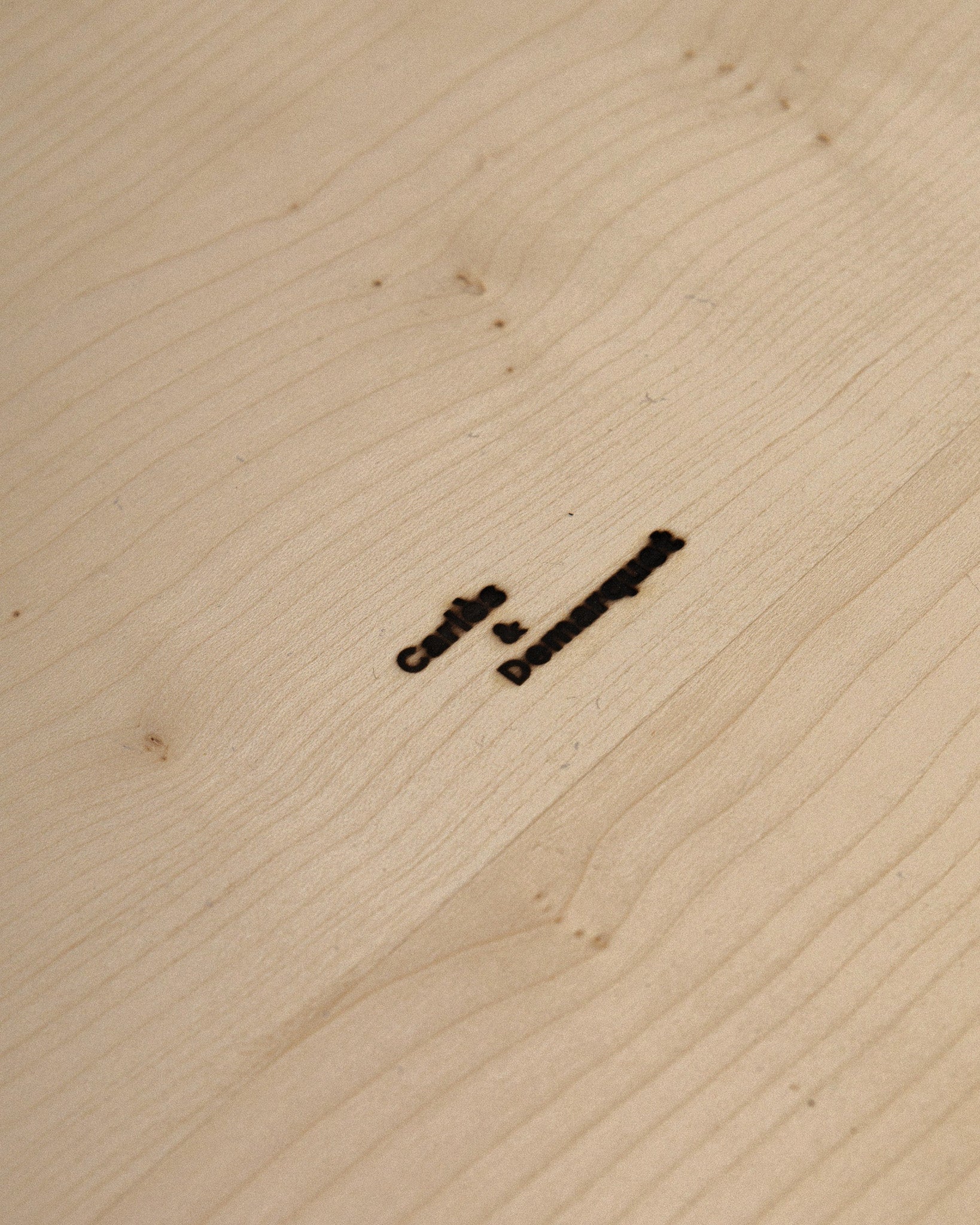 Table à manger "Ondes" en bois d'érable massif, créée par l'atelier Carles et Demarquet. Pièce unique teintée avec des couleurs végétales et vernie, fabriquée à la main dans leur atelier à Marseille. Toutes les productions de l'atelier sont des pièces uniques ou produites en petites séries.