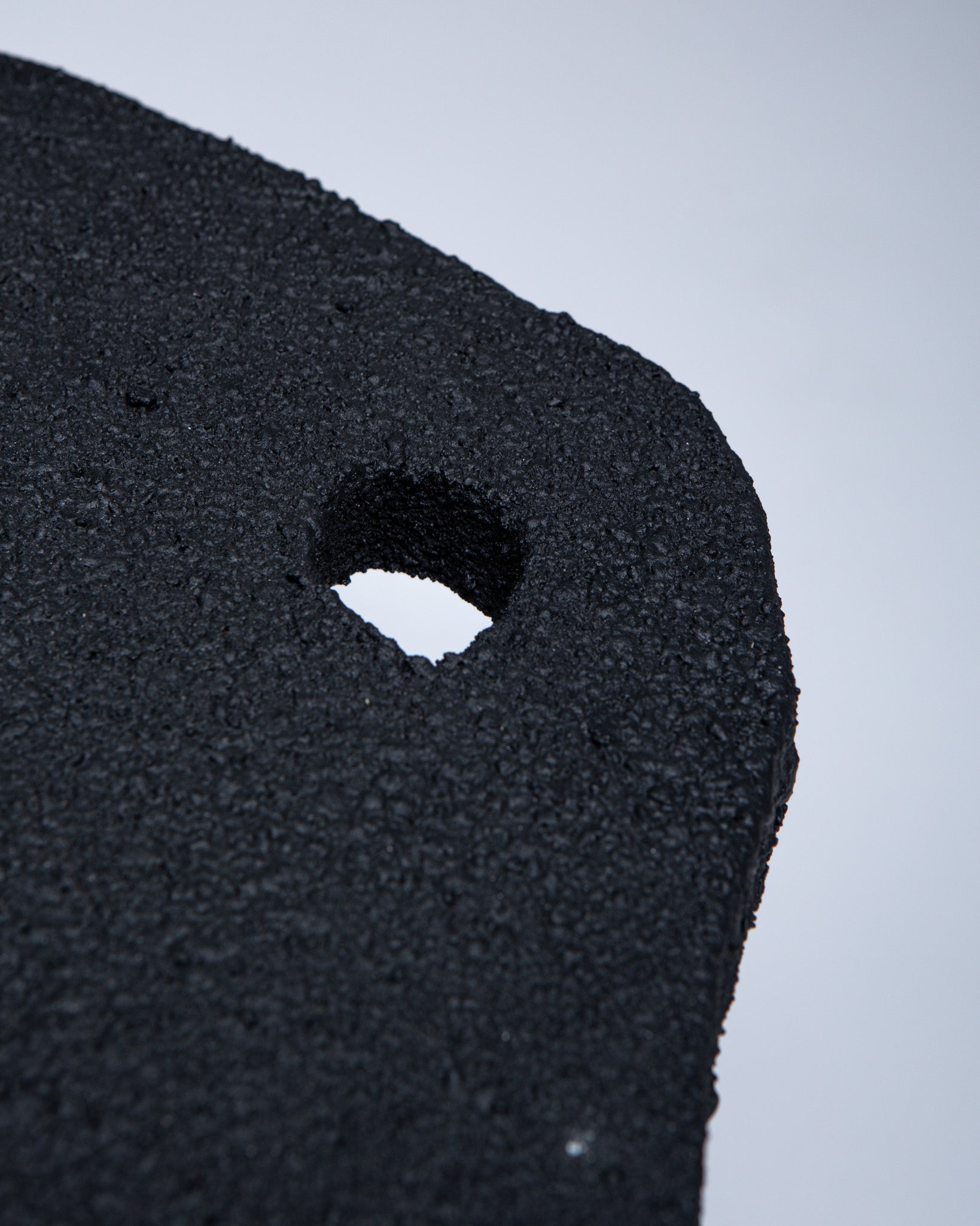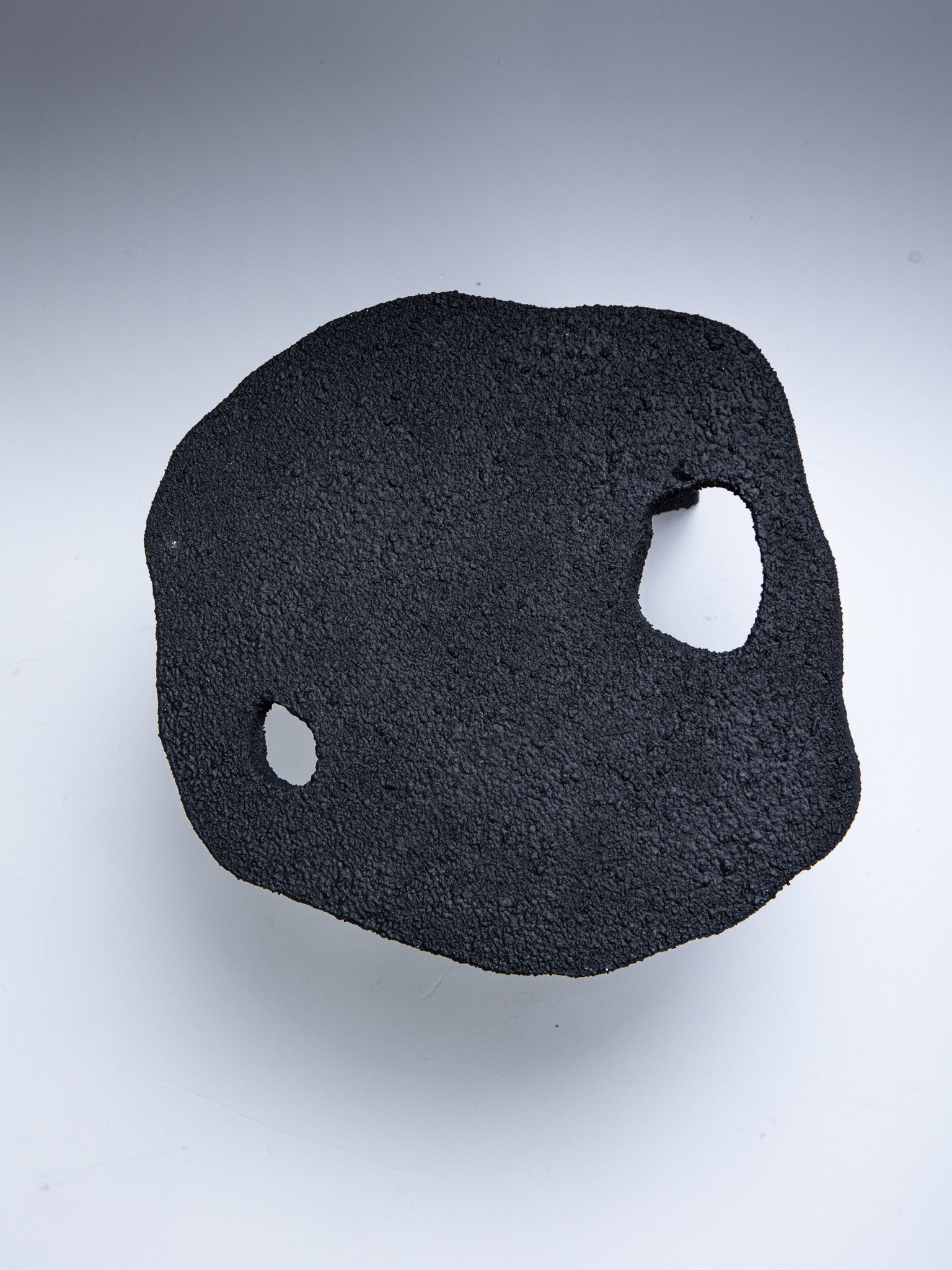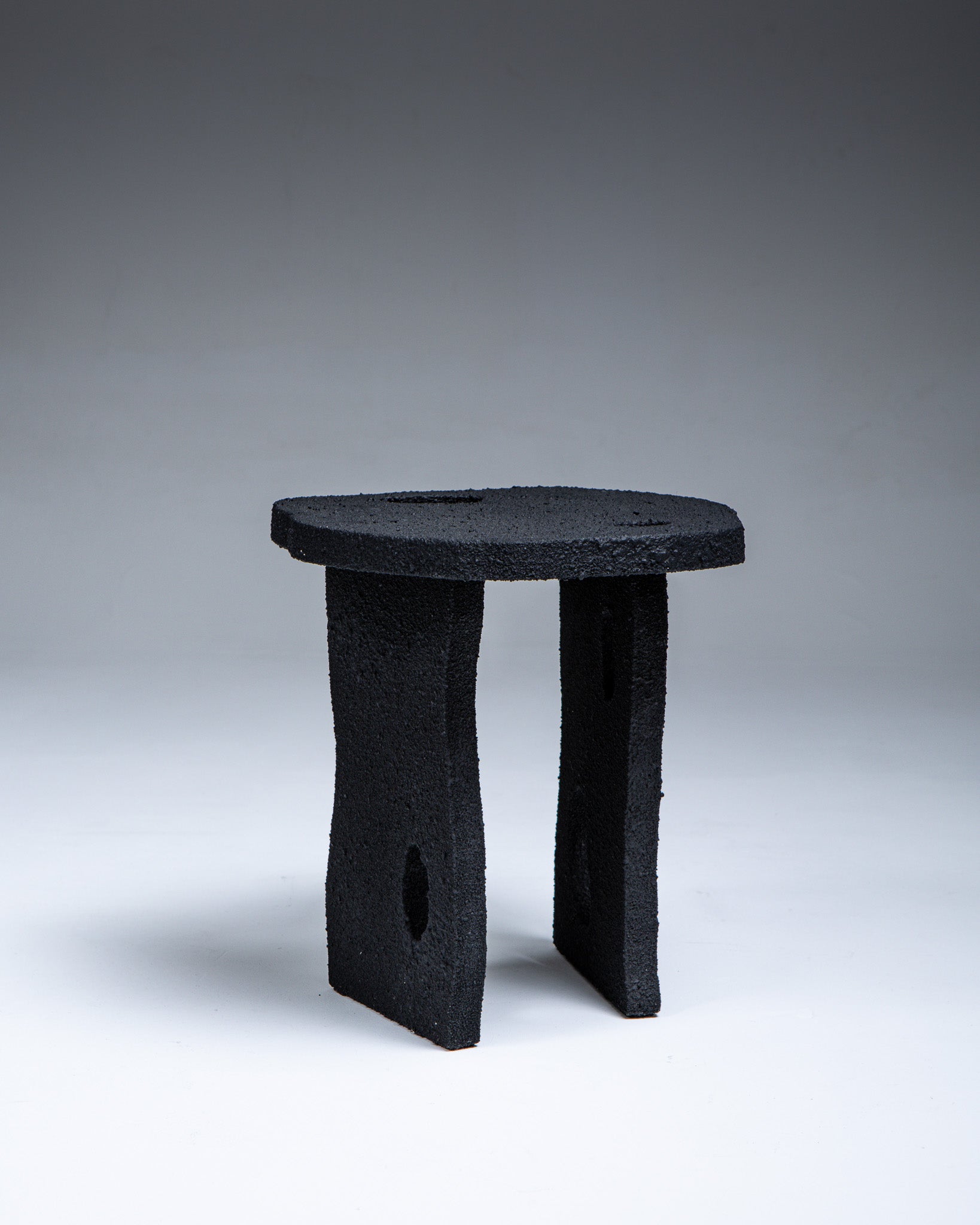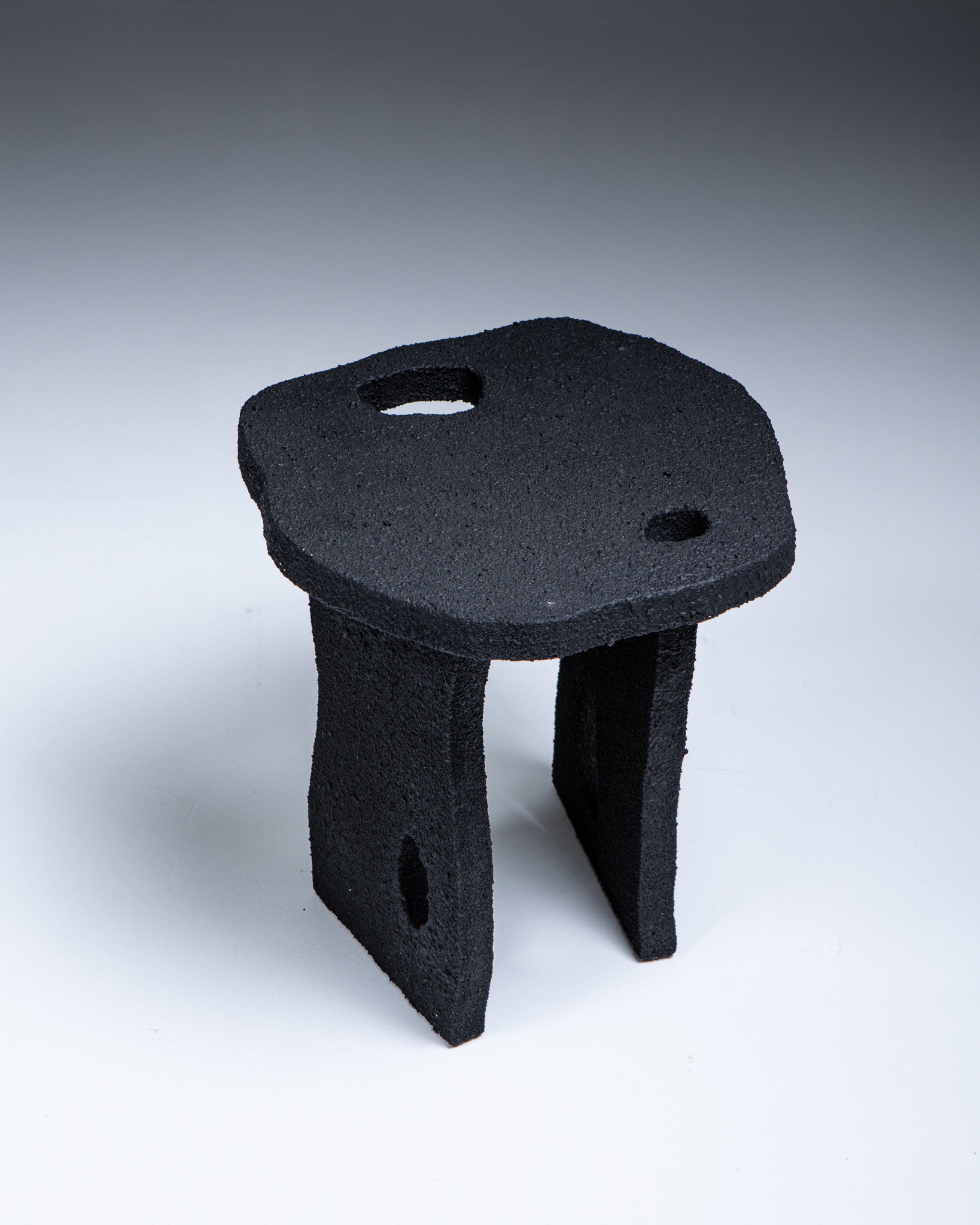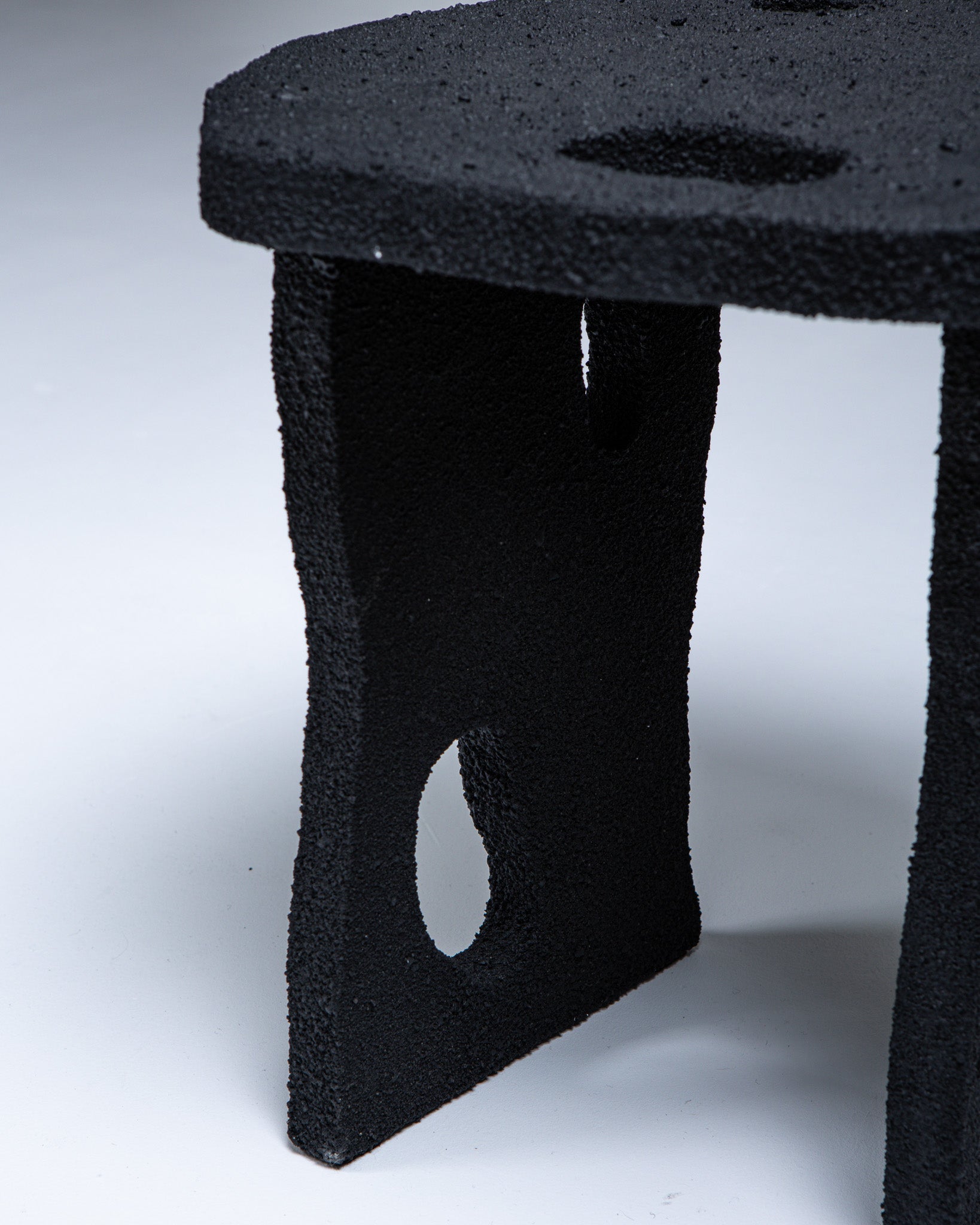Tabouret de forme libre avec motif de trous, reposant sur un double piétement plein reprenant le même motif. Le tabouret est en bois recouvert de sable, avec une surface noire mate et texturée, granuleuse.