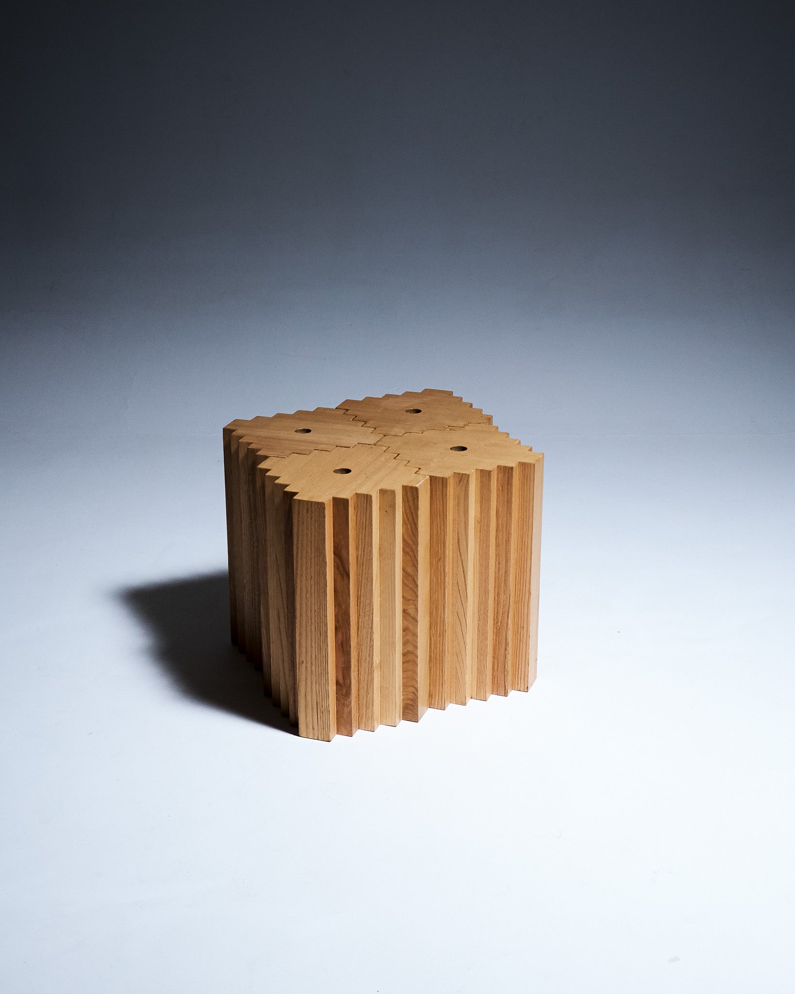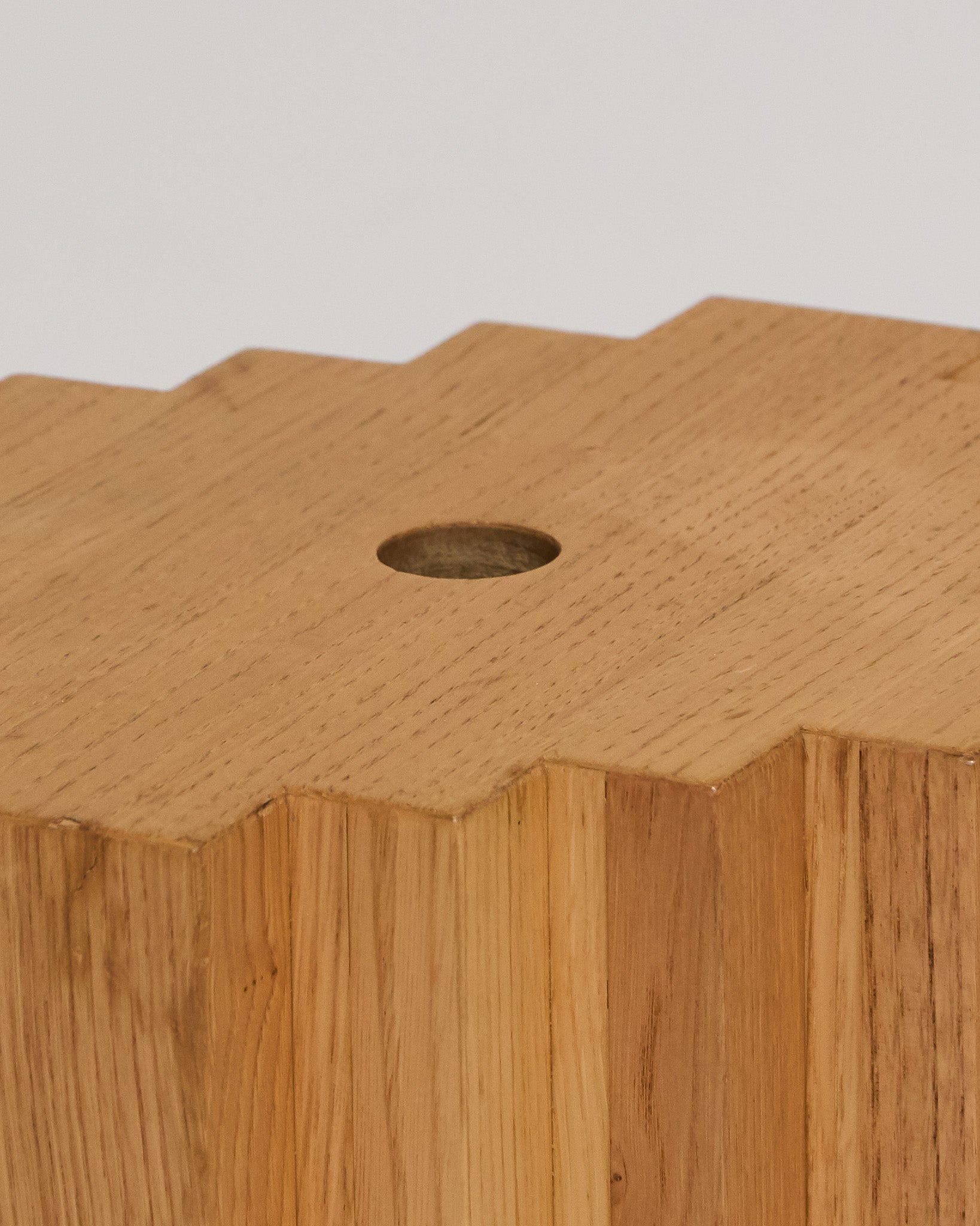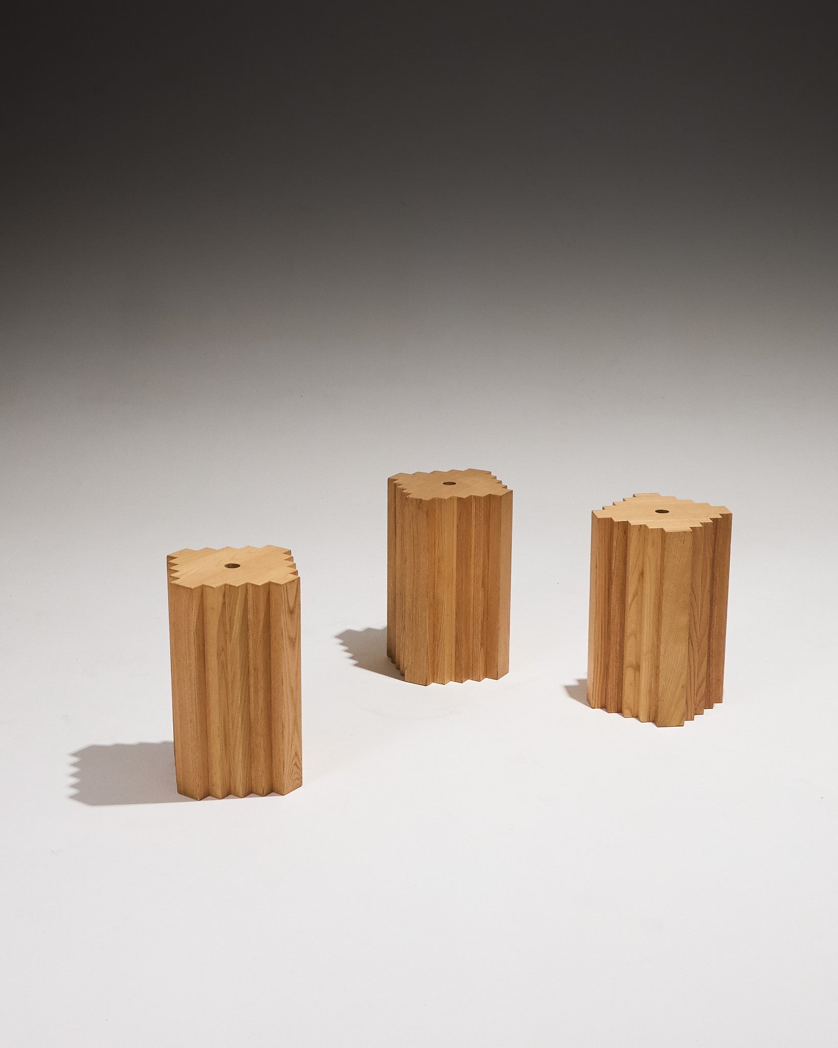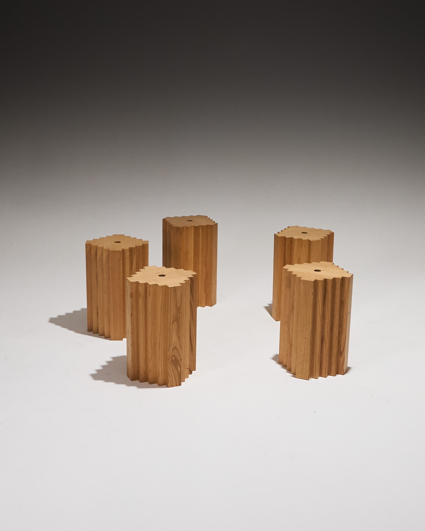 Tabouret modulable en châtaigner massif, volume cylindrique sculpté de crénelures verticales formant un motif en escalier. Les faces cannelées permettent l'emboîtement de plusieurs modules, créant des compositions libres au sol. Peuvent être utilisés seuls en tabouret ou table d'appoint, ou assemblés pour former un banc ou une table basse.