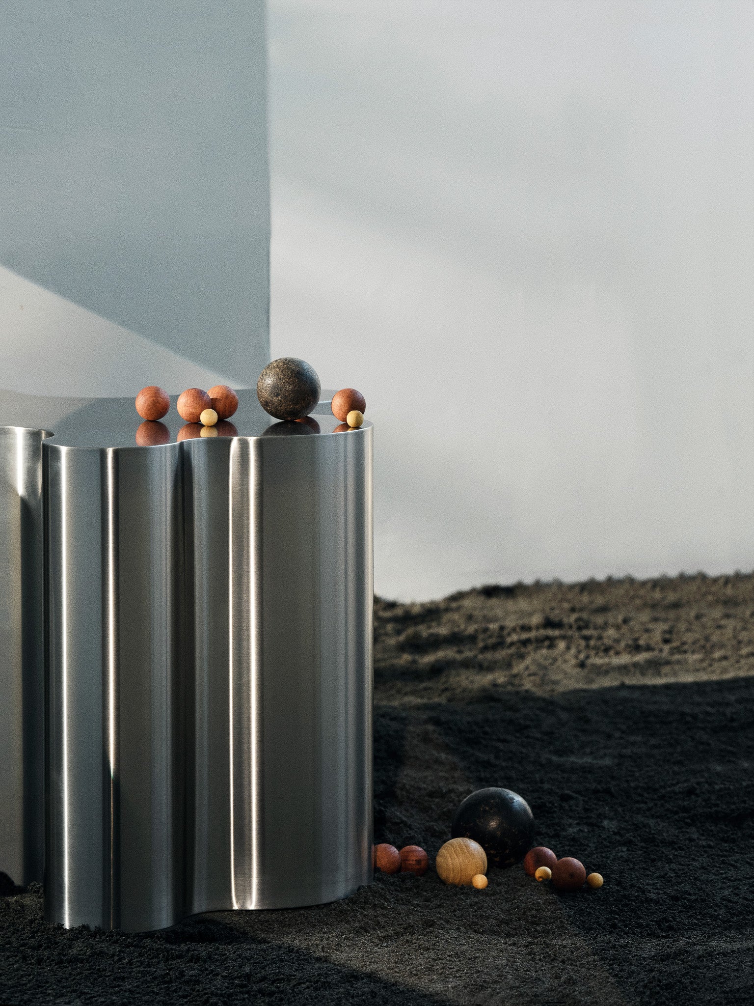 TABLE D'APPOINT OU BLOC "SILVER ROOT" EN ACIER INOXYDABLE, FABRIQUÉE À LA MAIN PAR LA DESIGNER CAIA LEIFSDOTTER.