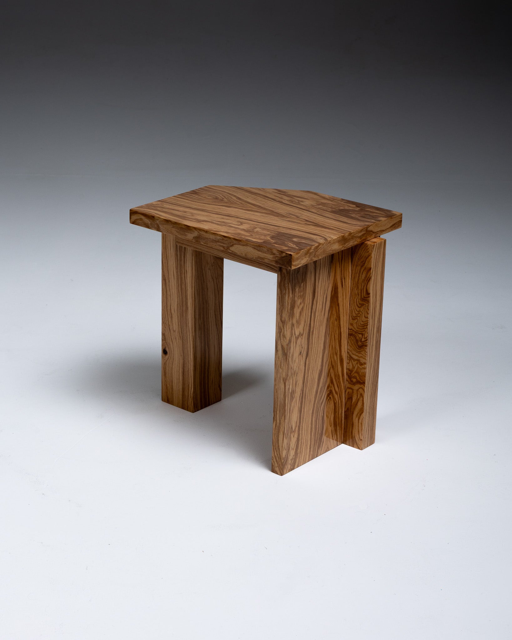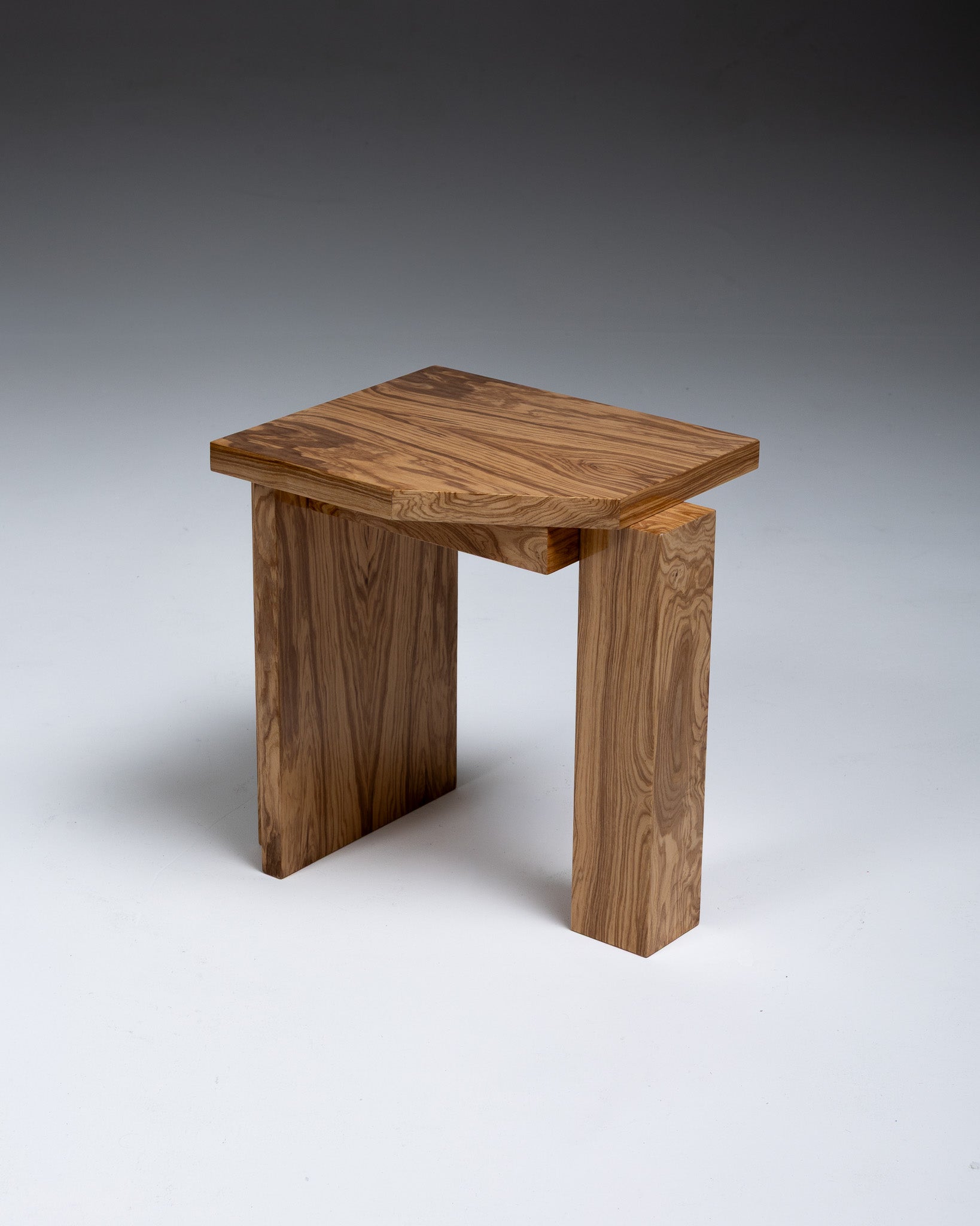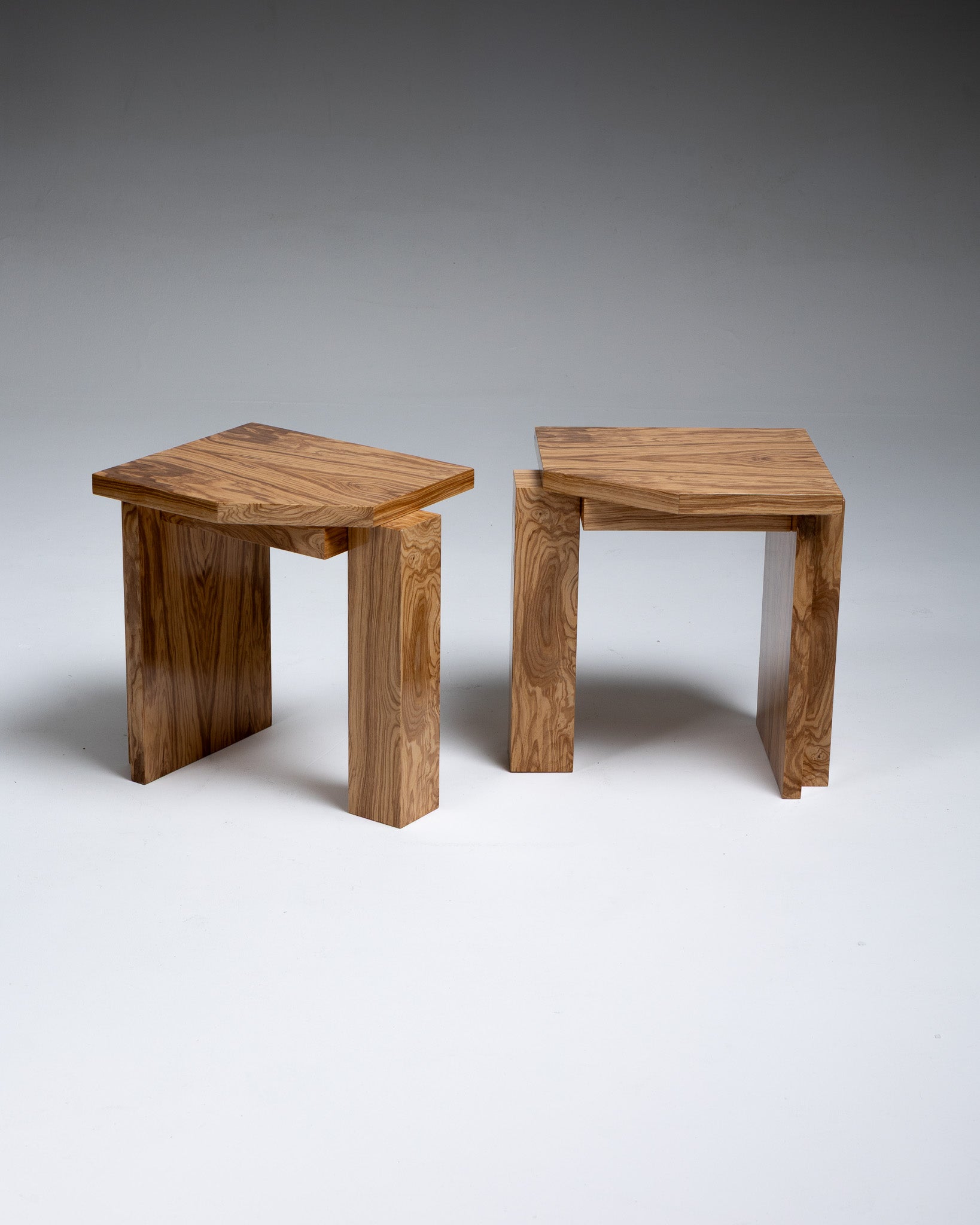 Tabouret aux lignes architecturales réalisé en MDF plaqué loupe de noyer (walnut burl veneer). La structure minimaliste repose sur deux piètements pleins supportant une assise carrée légèrement débordante, mettant en valeur le veinage riche et contrasté du placage.