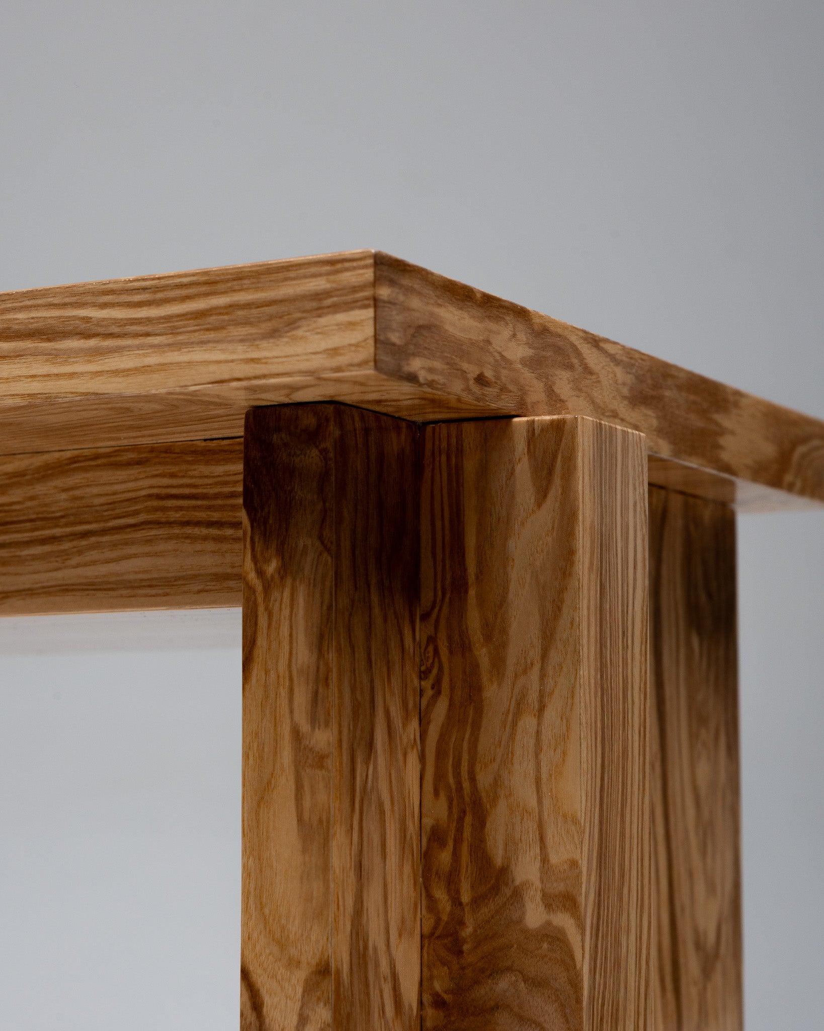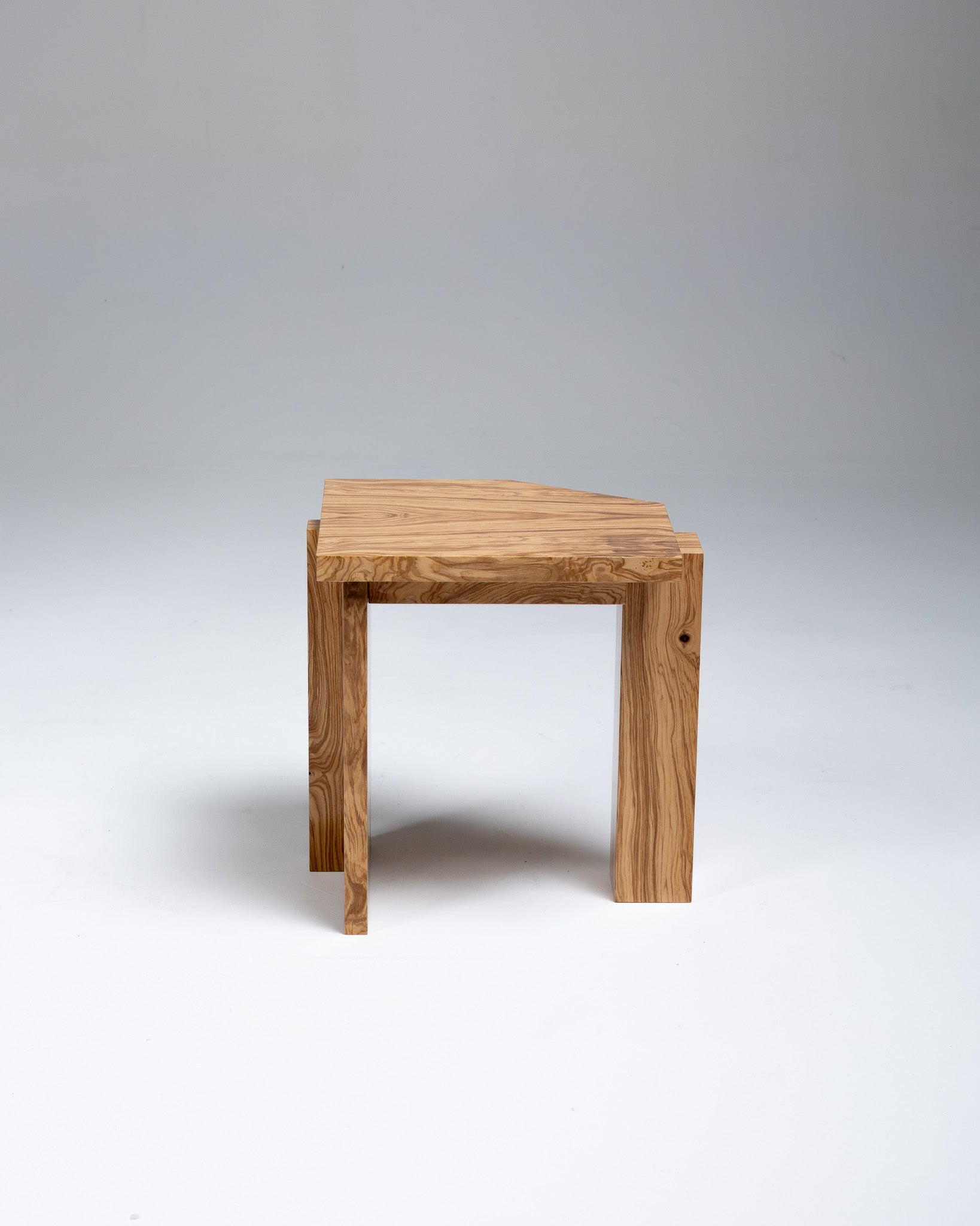 Tabouret aux lignes architecturales réalisé en MDF plaqué loupe de noyer (walnut burl veneer). La structure minimaliste repose sur deux piètements pleins supportant une assise carrée légèrement débordante, mettant en valeur le veinage riche et contrasté du placage.