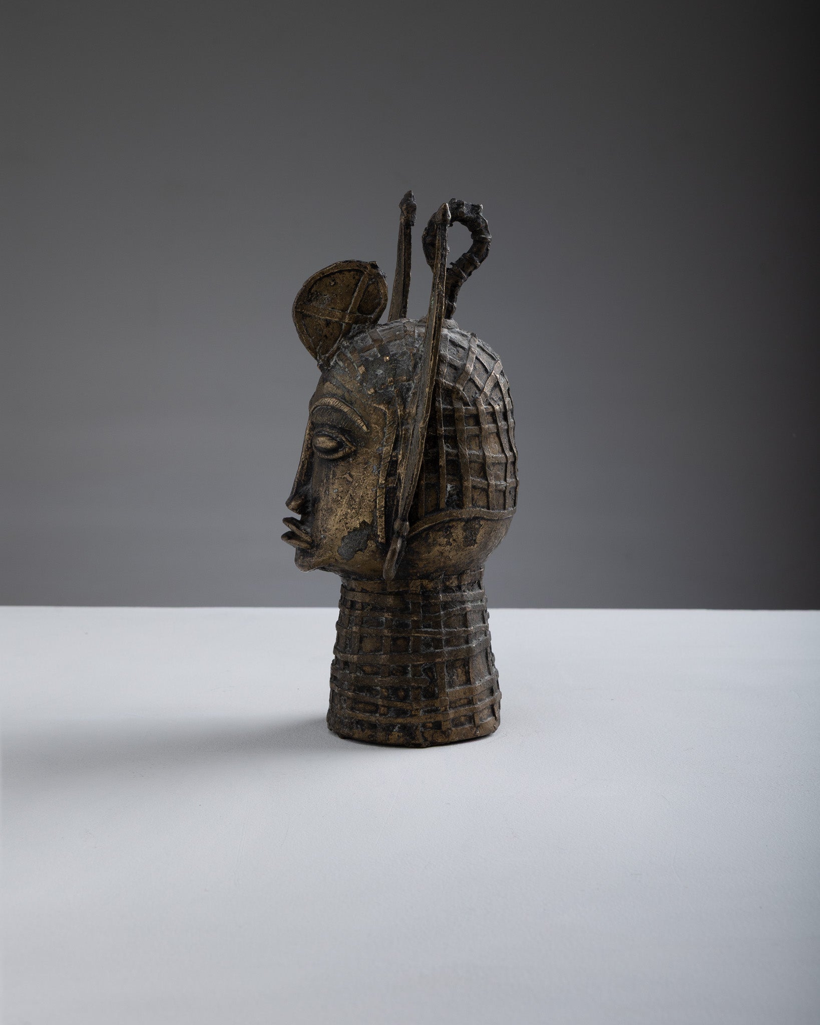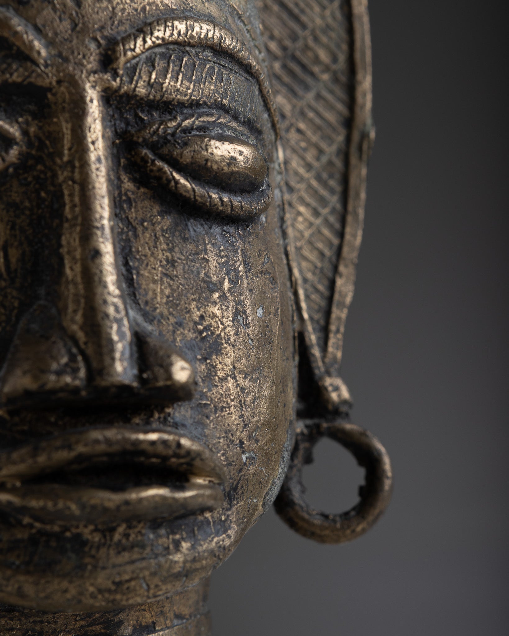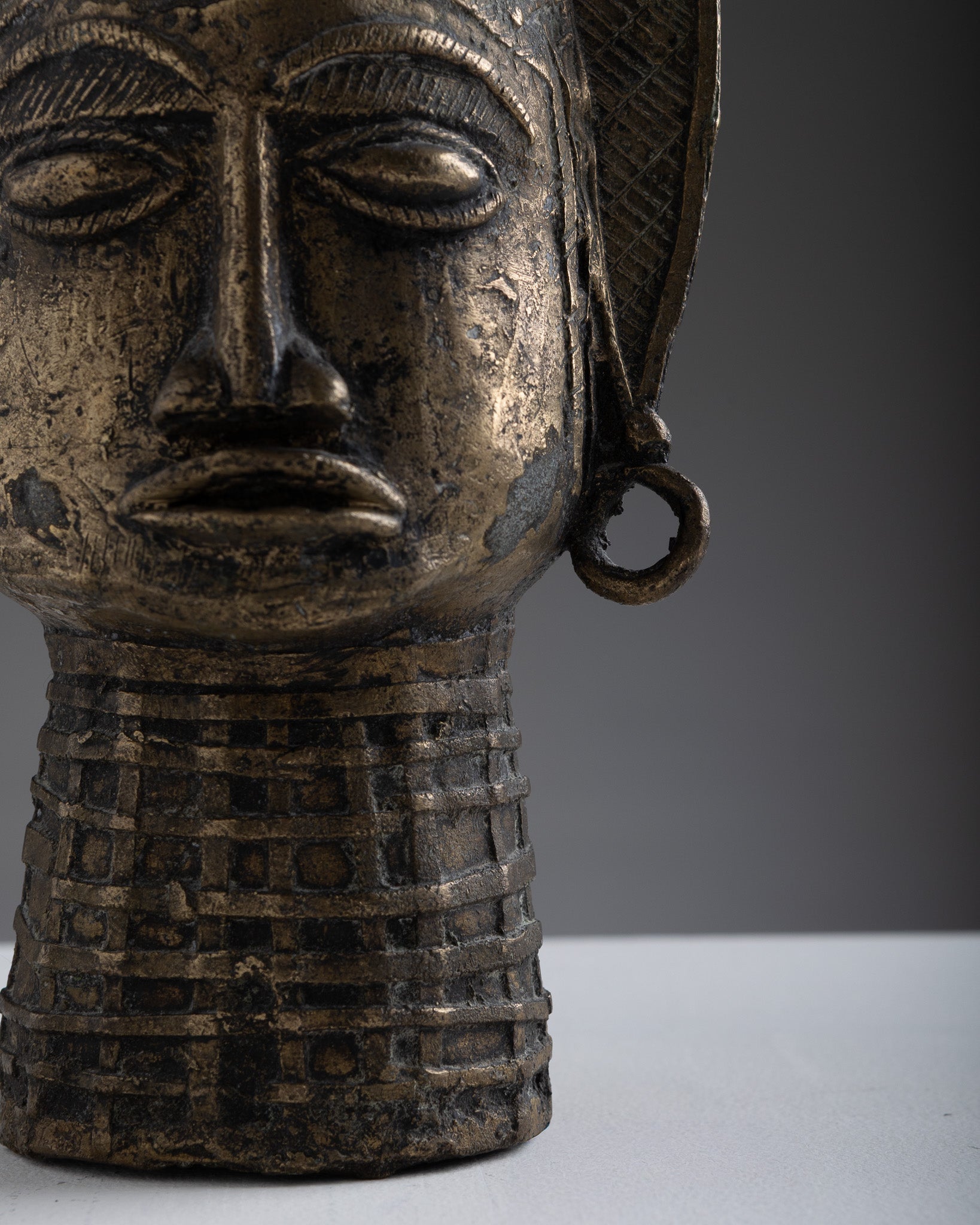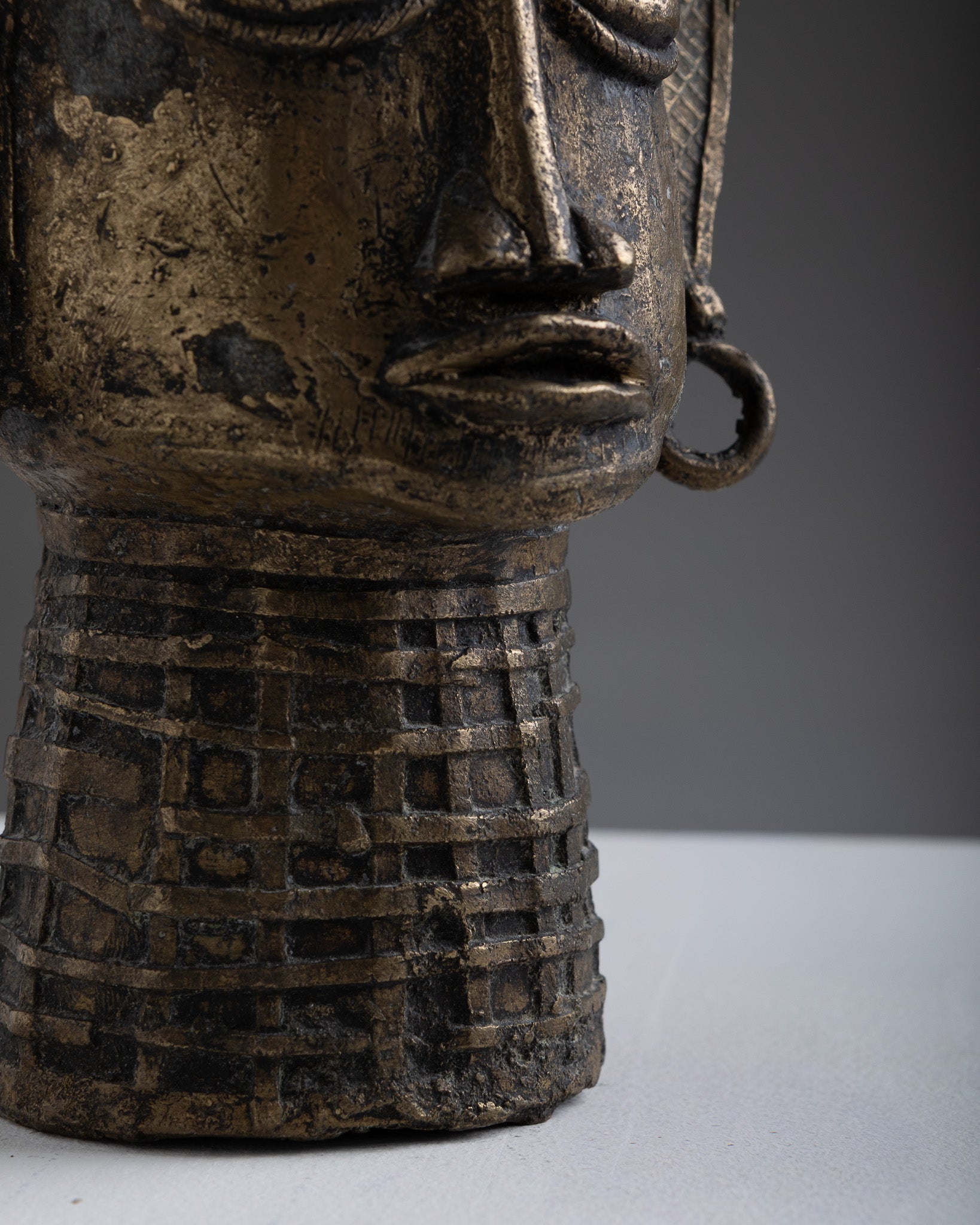 Tête décorative sculptée en laiton, représentant un visage stylisé aux traits hiératiques, coiffé d'un ornement vertical et prolongé par un cou finement rythmé de motifs géométriques. Travail des années 1960, dans l'esthétique africain et du goût des ateliers Ifé.