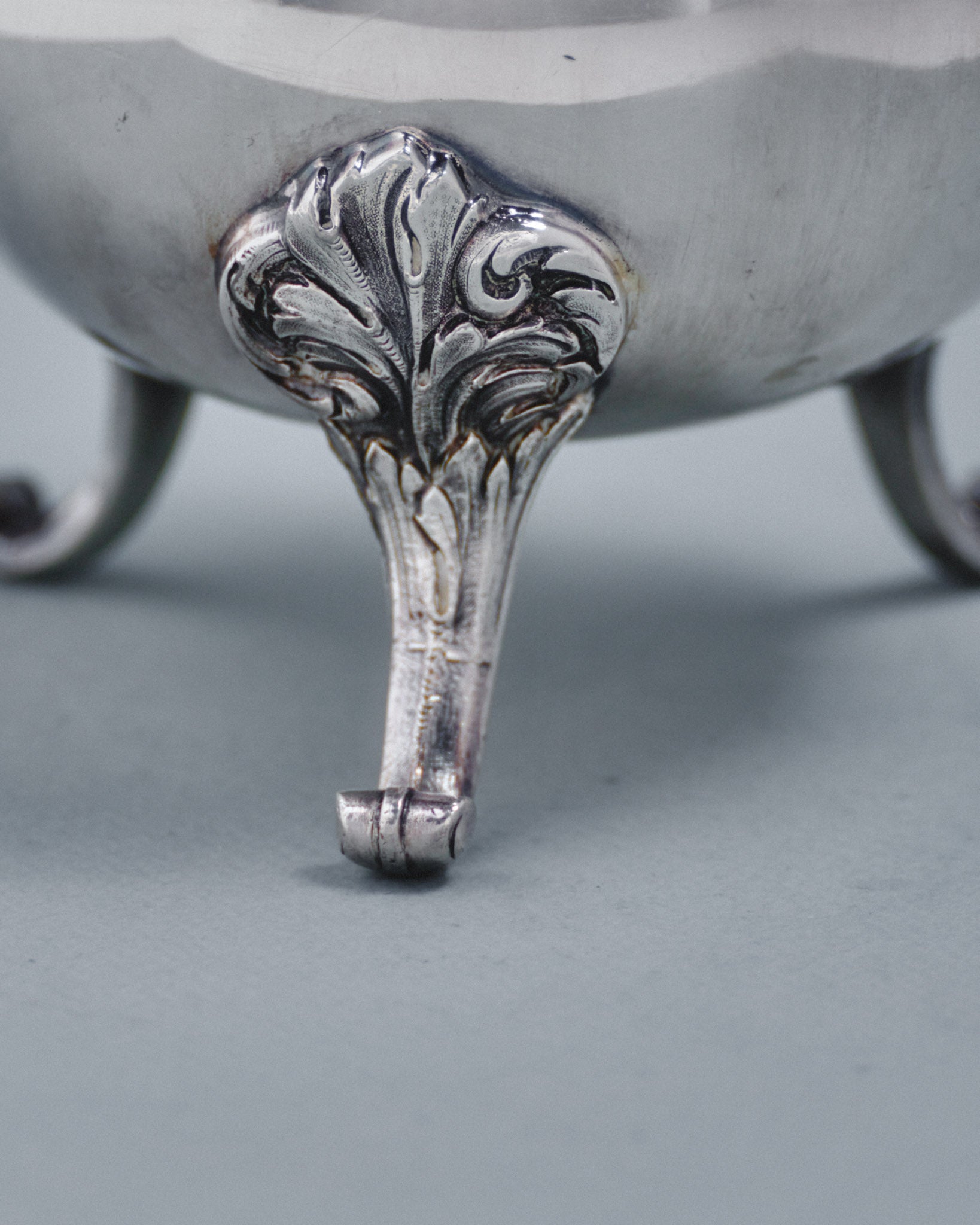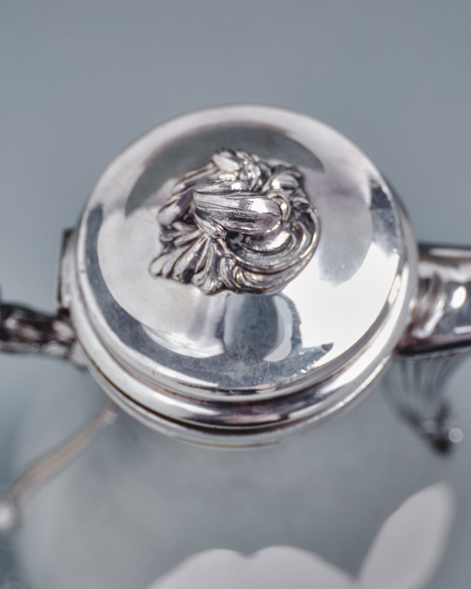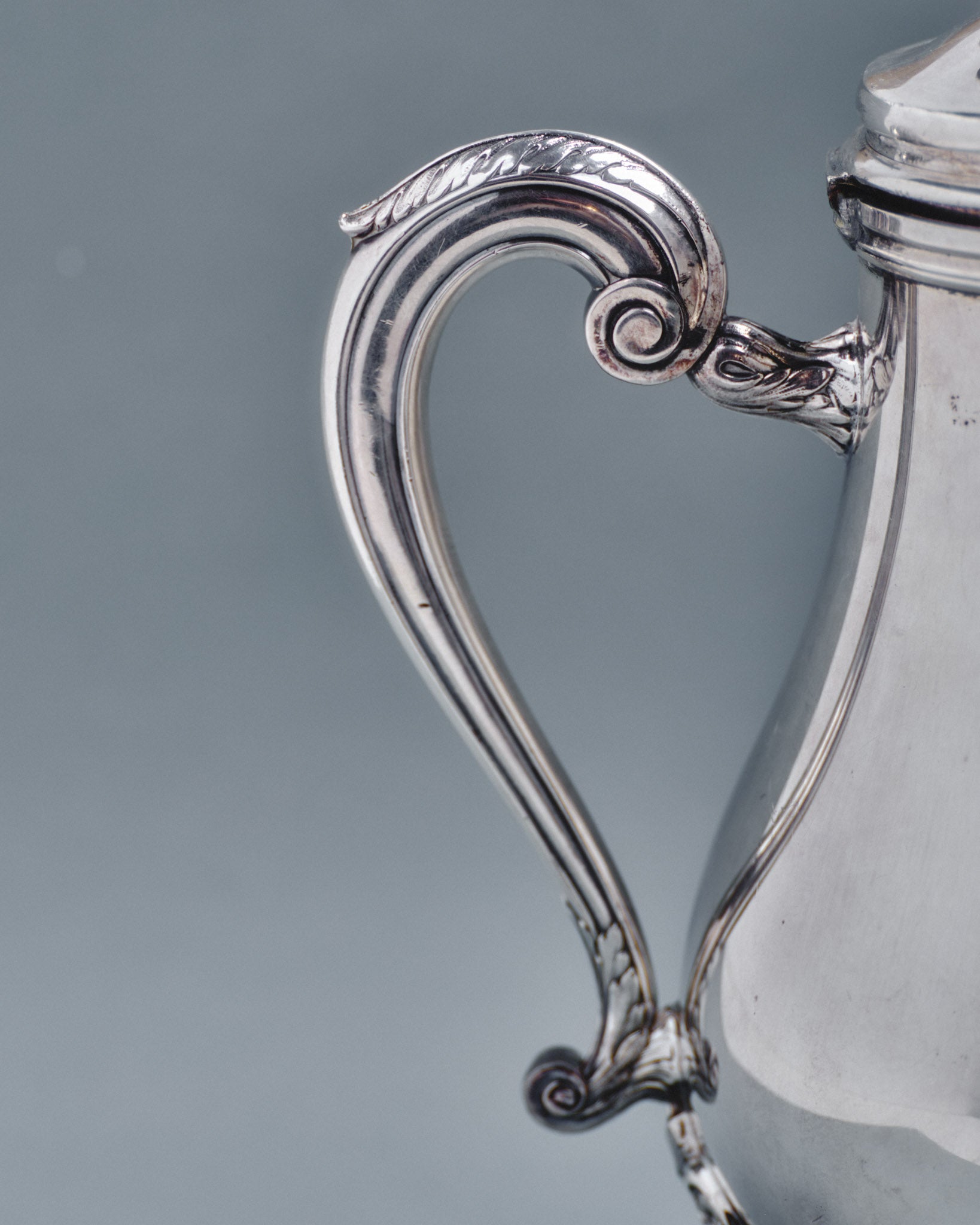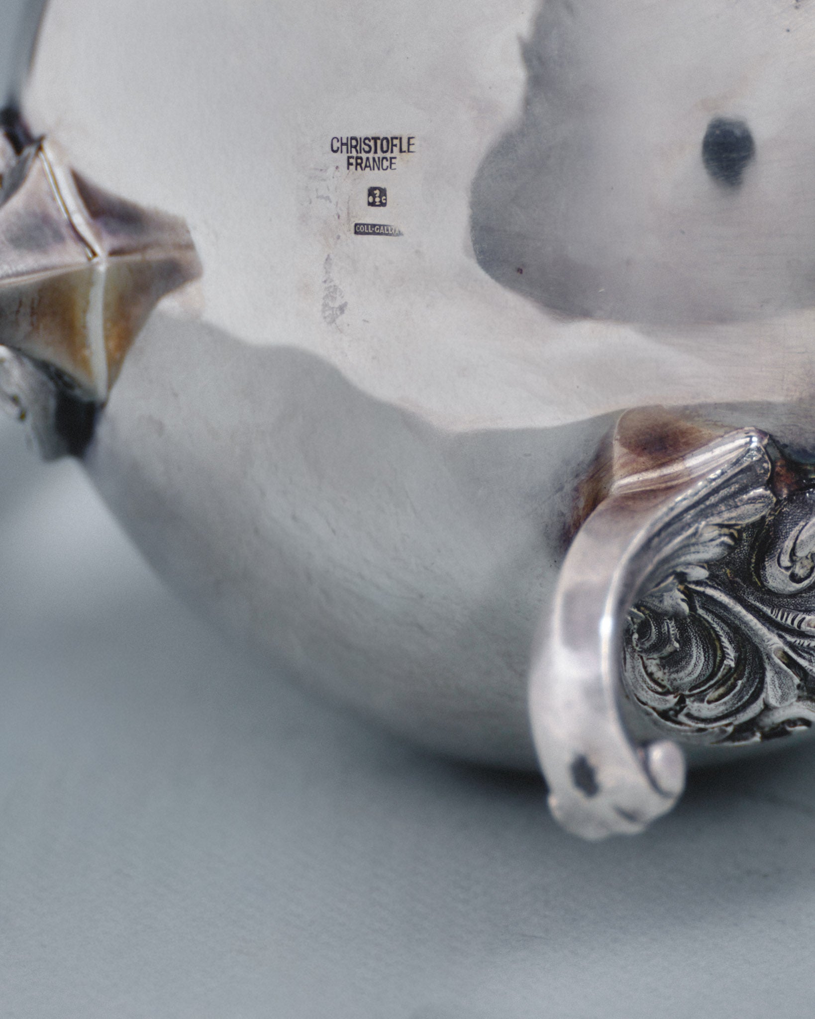 Théière en métal argenté de la maison Chistofle. Modèle Marli de style Louis XV reposant sur 3 pieds avec un décor végétal sur l'anse, les pieds, le bec ainsi que sur le couvercle. Poinçonné au-dessous. Très bon état avec une partie conforme à l'âge et à l'usage.