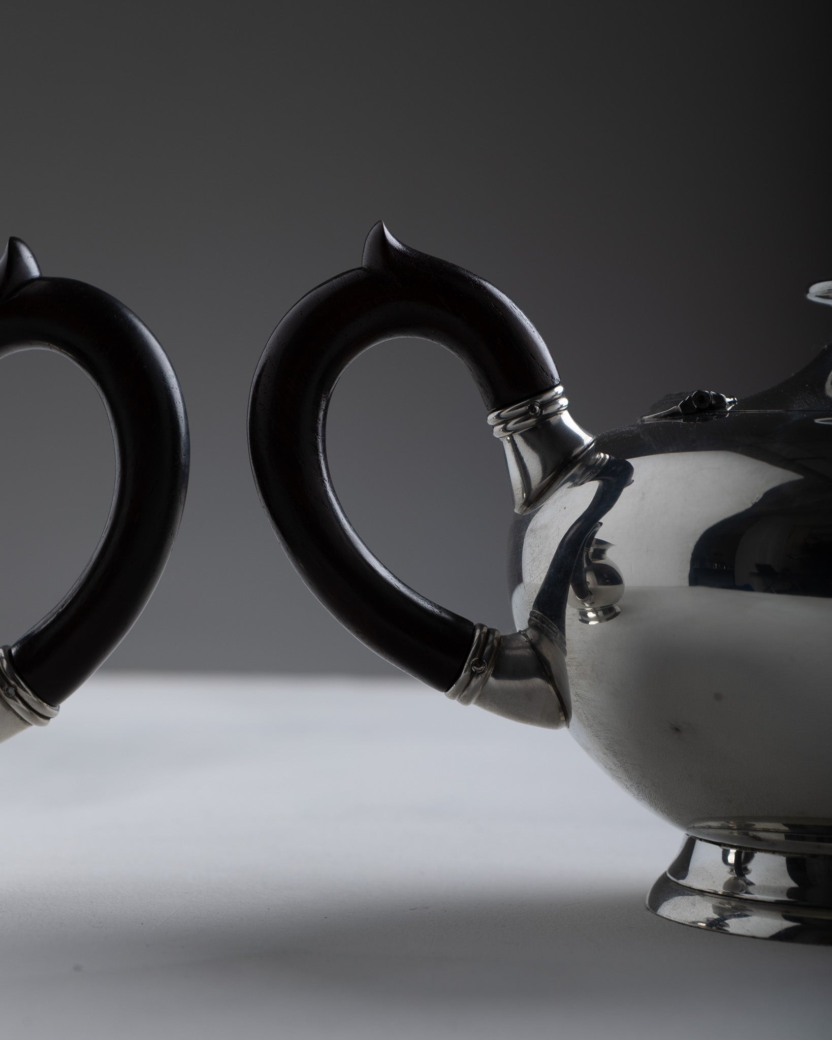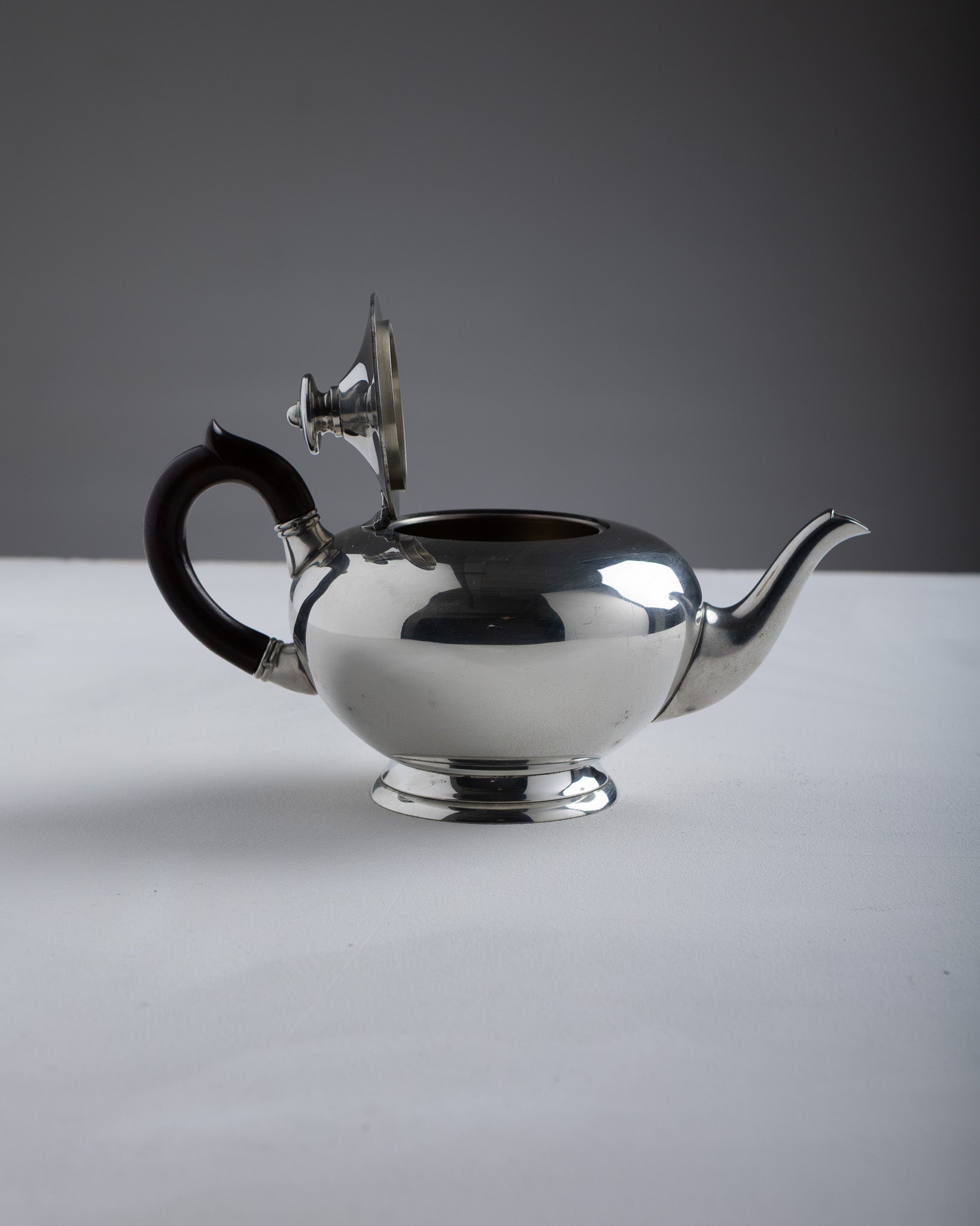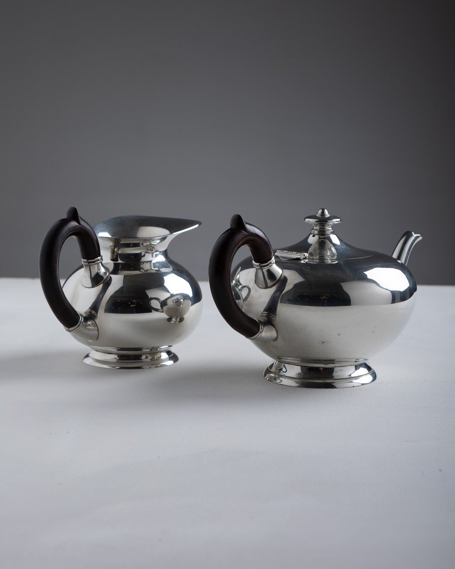Ensemble composé d'une théière et d'un pot à lait en étain argenté, fabrication française, Les Étains du Manoir, dans les années 1960. Les deux pièces présentent un corps bombé reposant sur un piédouche circulaire, un bec verseur rapporté et des anses en bois fixées par bagues métalliques. La théière est munie d'un couvercle amovible avec prise centrale.