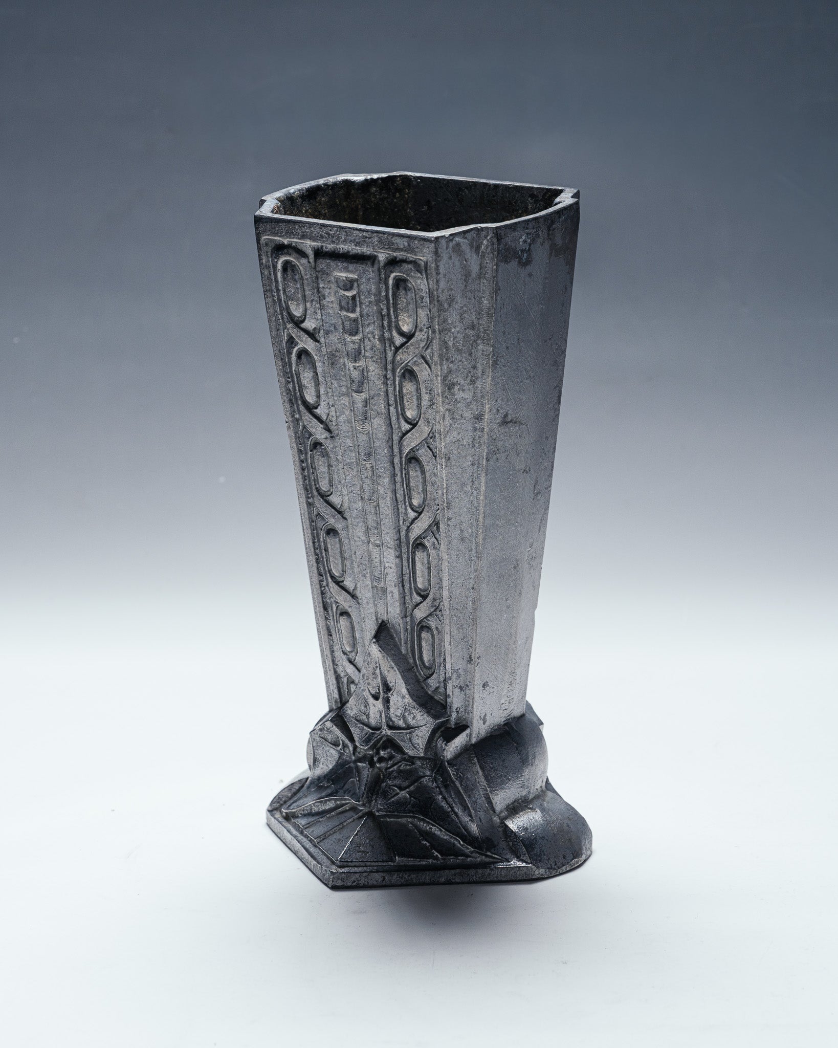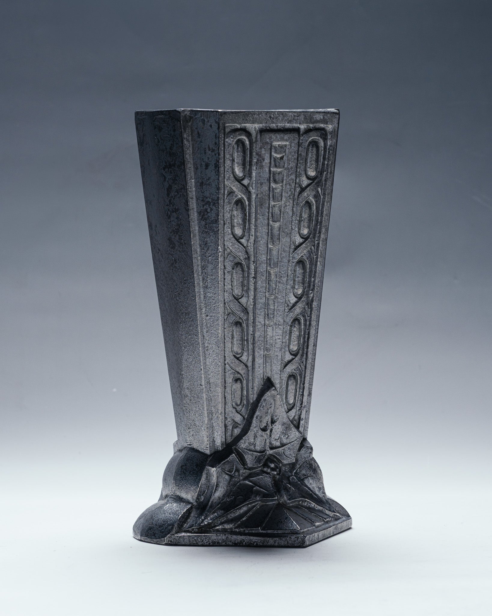 Vase Art Déco à section polygonale en fonte d'aluminium patinée. Décor en relief de motifs géométriques stylisés, encadrant un panneau central vertical. Base sculptée à composition figurative, intégrée à l'ensemble architectural.