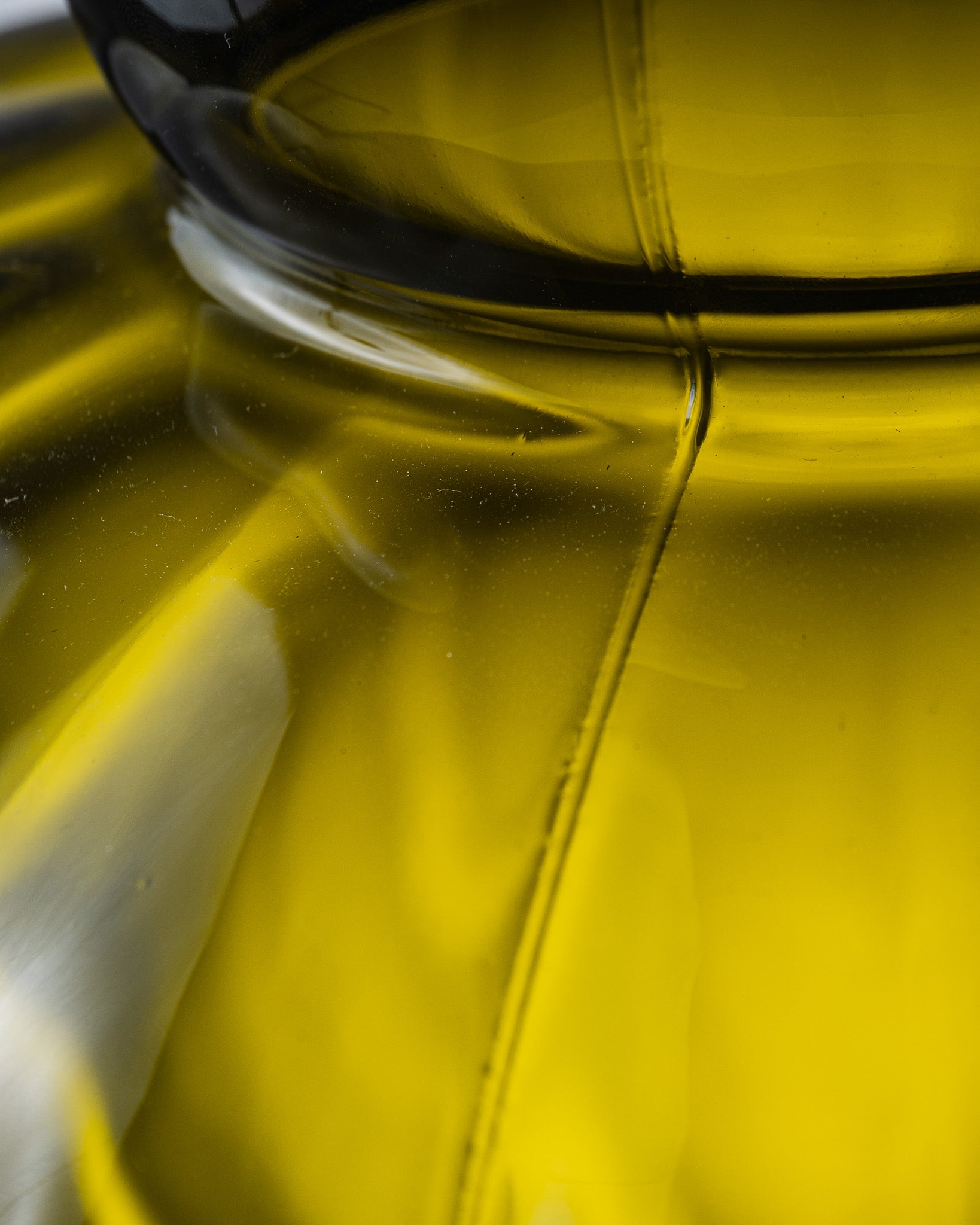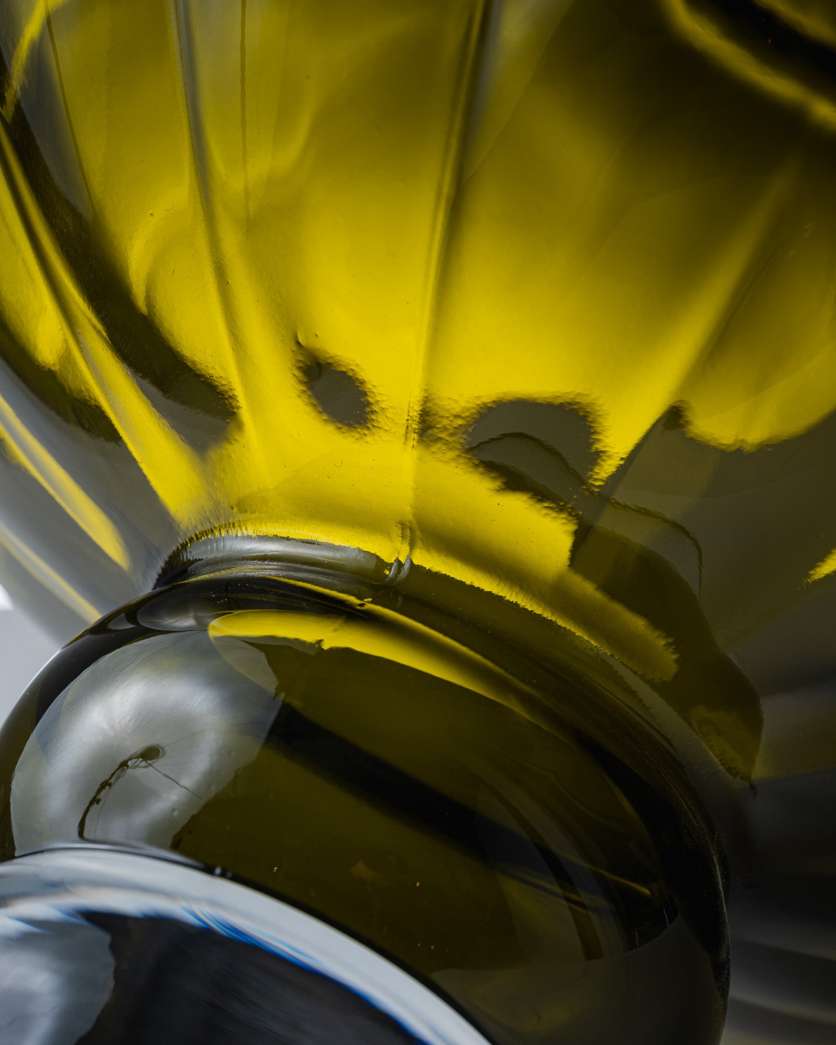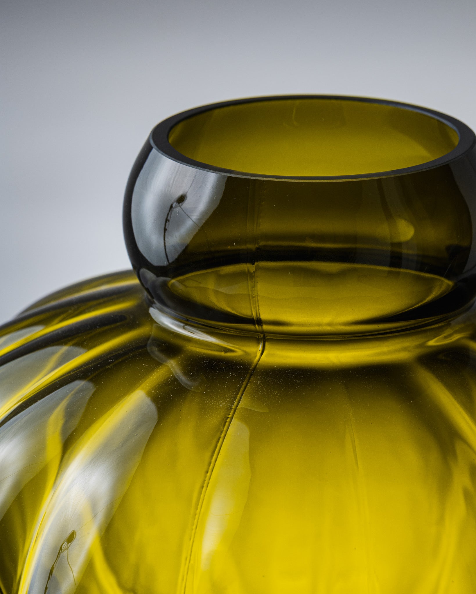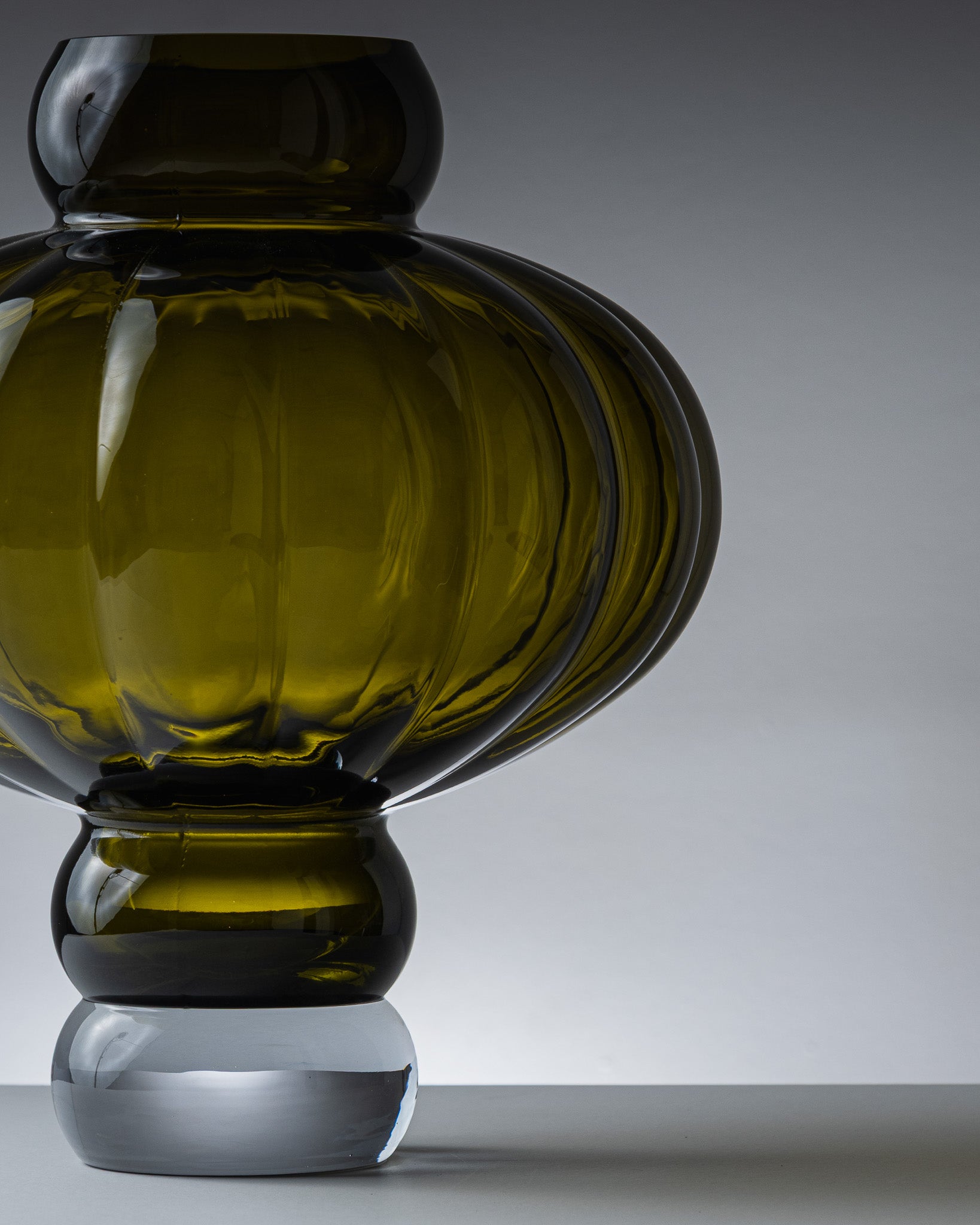 Vase en verre couleur olive, modèle Balloon 03 par Louise Roe. Pièce issue de la collection Balloon. Chaque pièce est faite à la main et présente de légères variations.