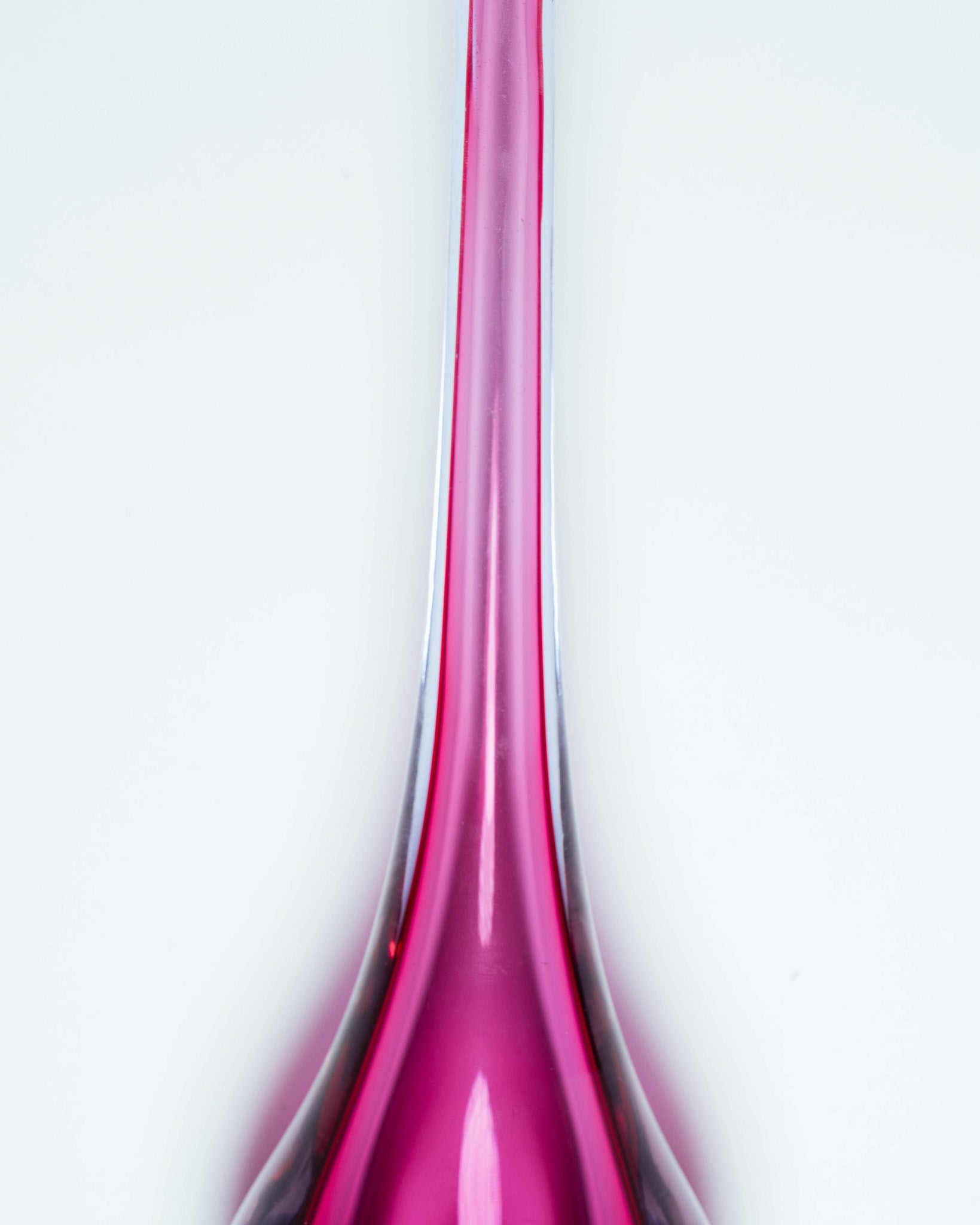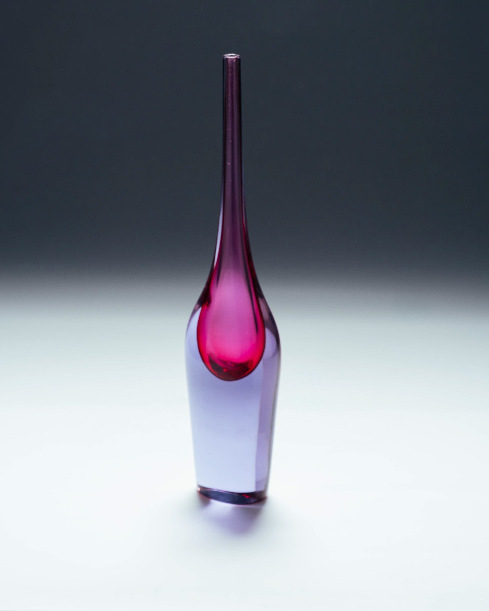 Vase en verre soufflé selon la technique sommerso, par Flavio Poli pour Suguso Vetri d'Arte. Présentant un noyau rouge rubis emprisonné dans une enveloppe de verre violet translucide. Forme élancée, base circulaire s’élevant vers un long col étroit. Travail typique de Murano des années 1950. Très bel état général.