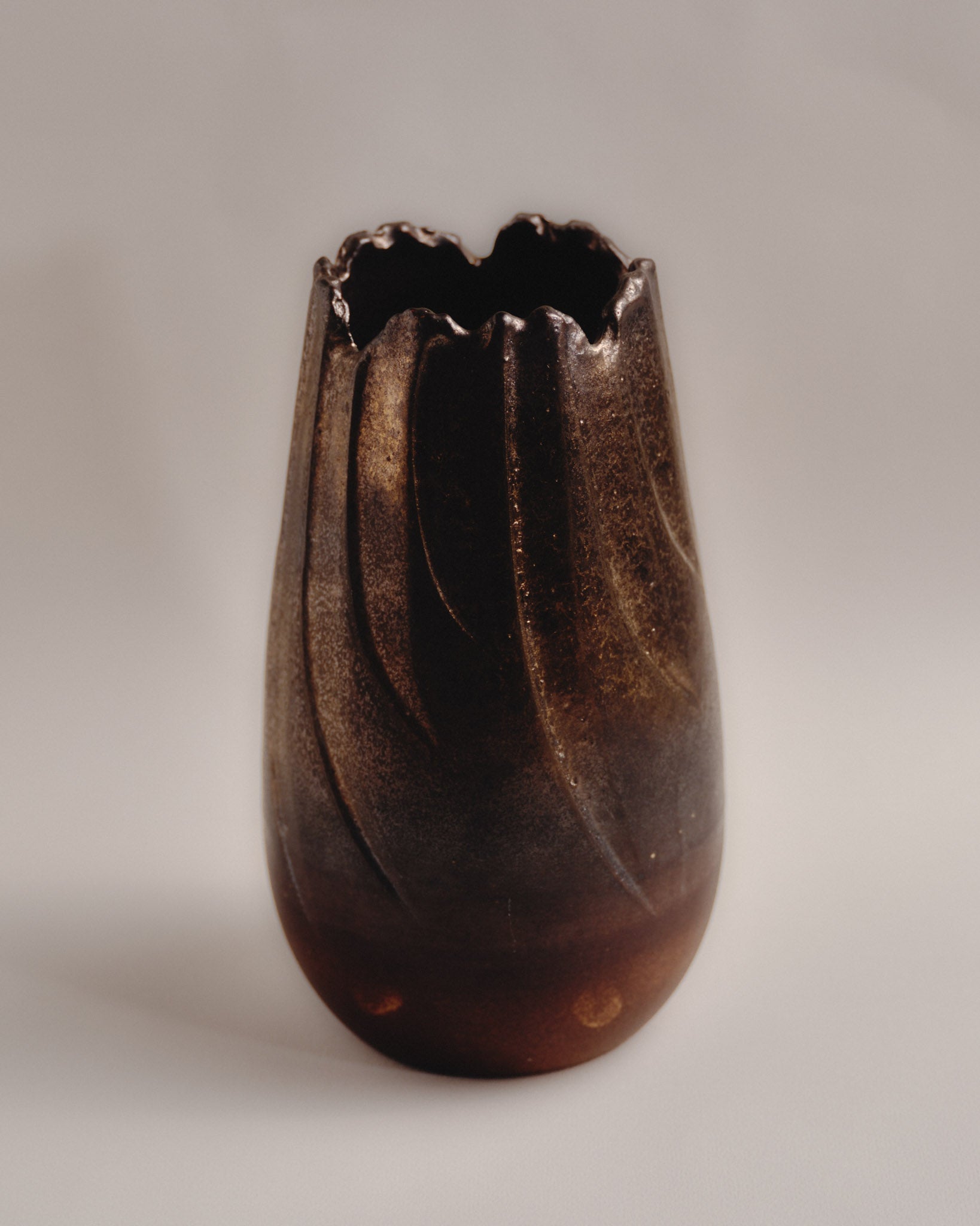 Vase japonais en grès émaillé. Forme ovoïde à décor brutalist dans des tons dégradés de brun, à col strié et lèvre irrégulière. Signé à la base par l'empreinte digitale de l'artiste. Très bel état.