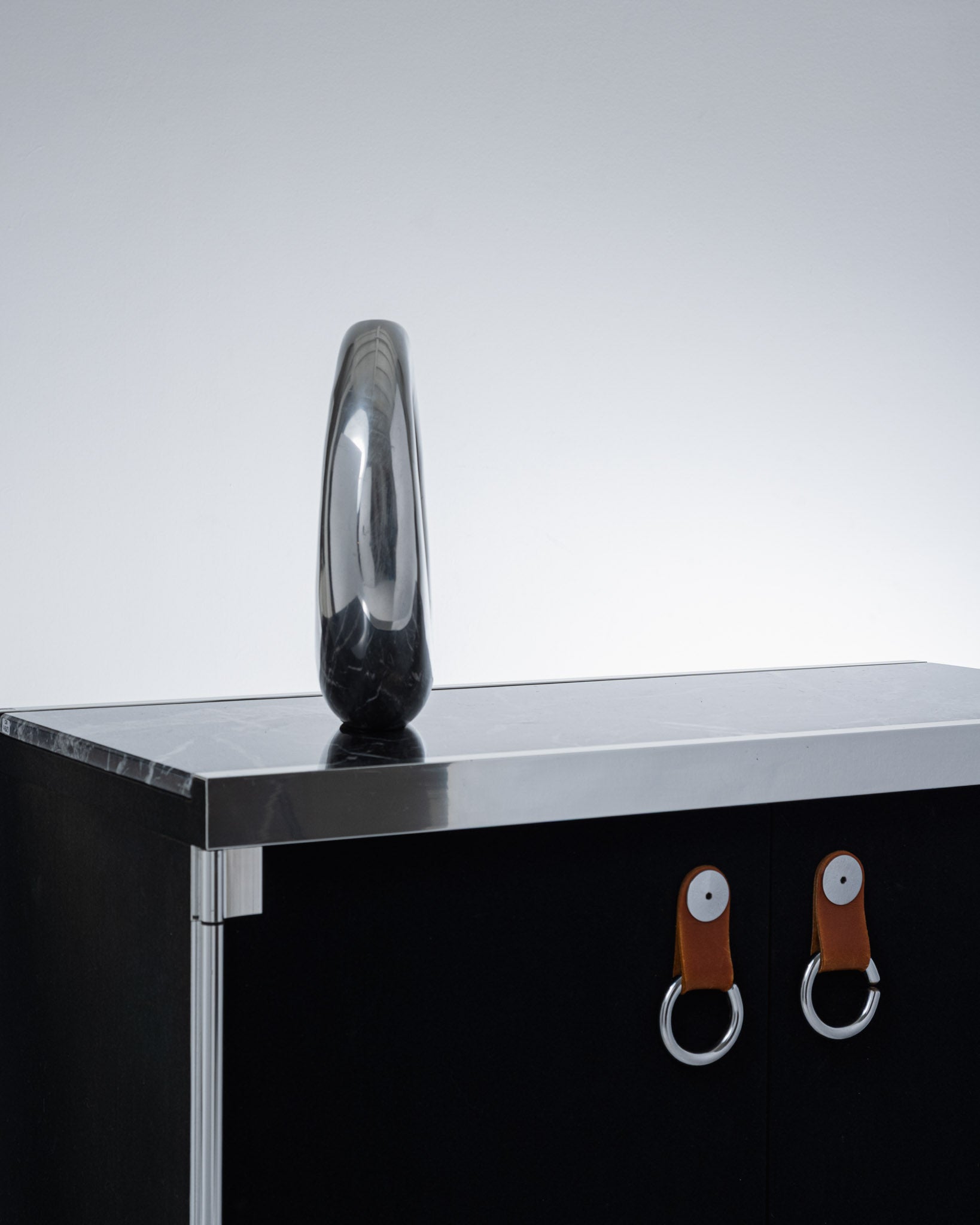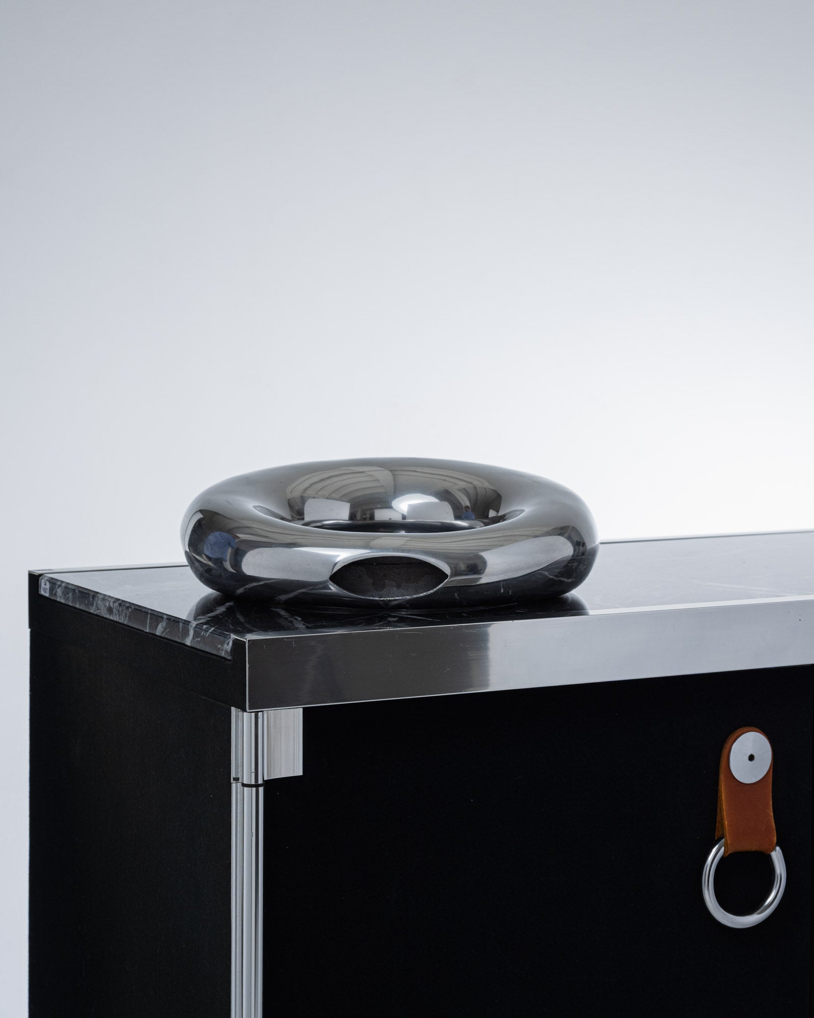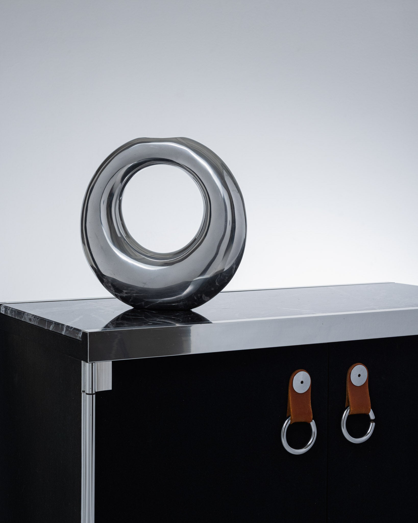 Vase soliflore en aluminium façonné à la main, années 1980. Forme circulaire évidée caractéristique du style Space Age, avec une finition polie. Bon état général.