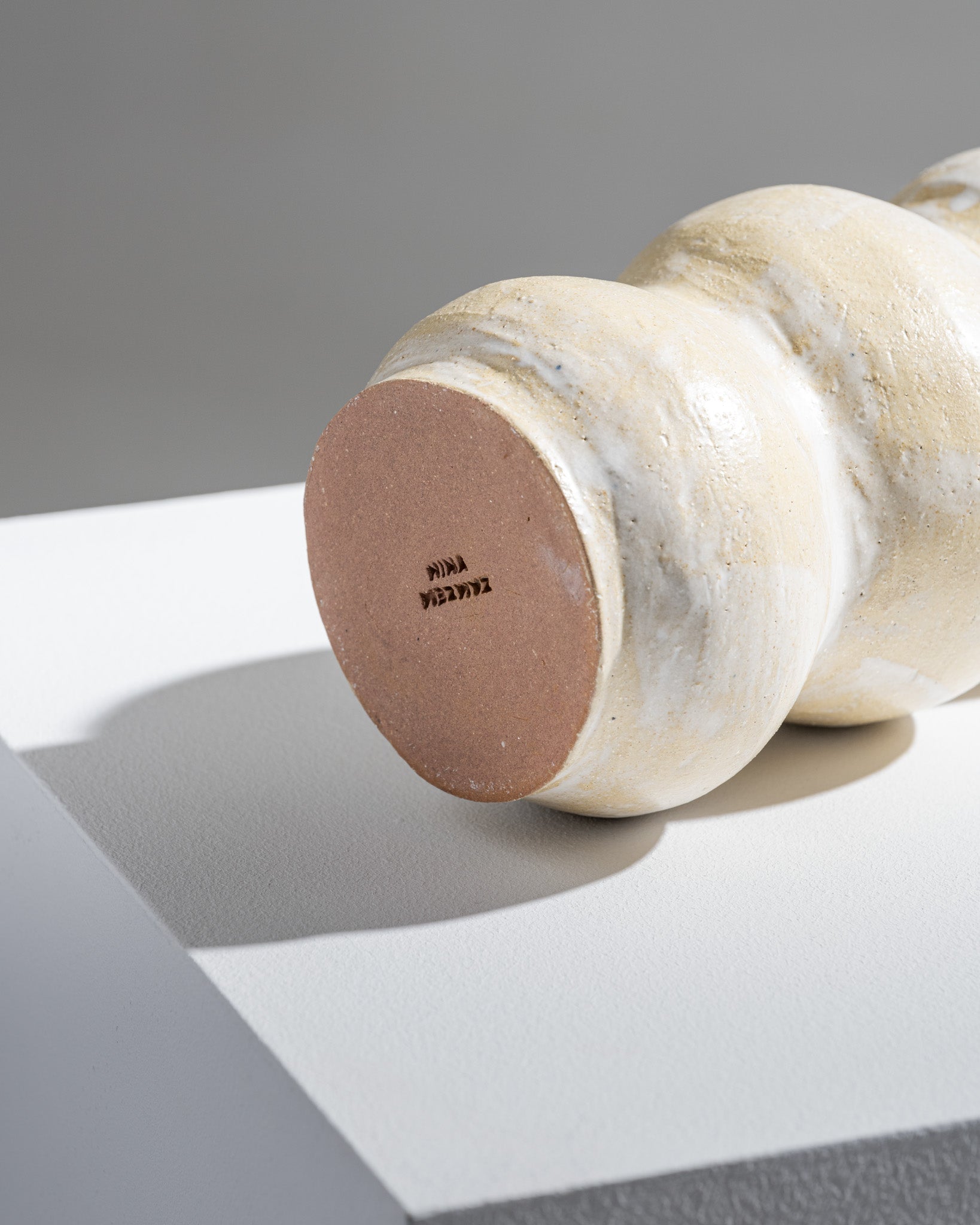 Vase en céramique fait main signé Nina Zamzem, à la silhouette totémique composée de trois volumes superposés. L’émail beige nuancé de blanc met en valeur les lignes organiques et sculpturales de la pièce.