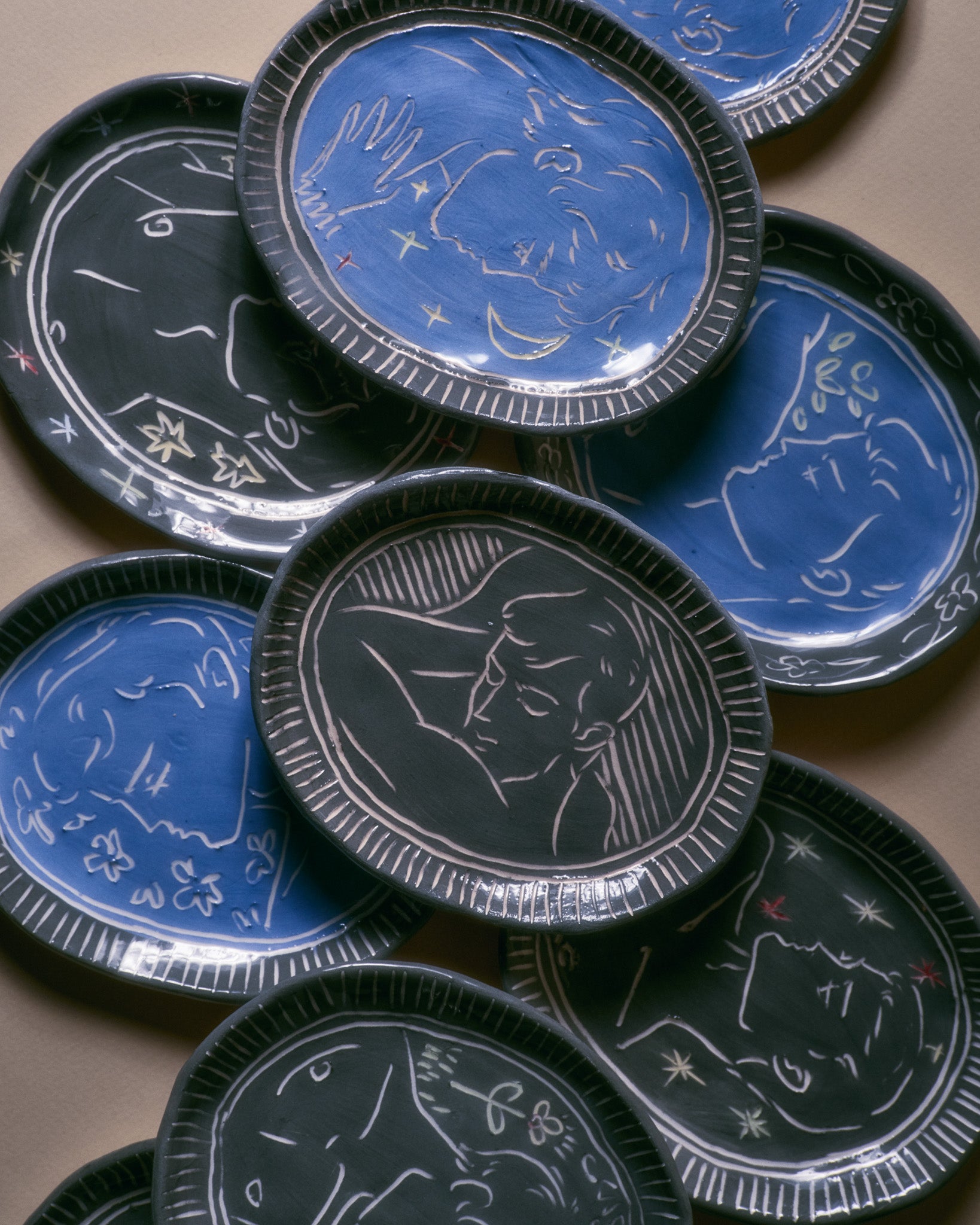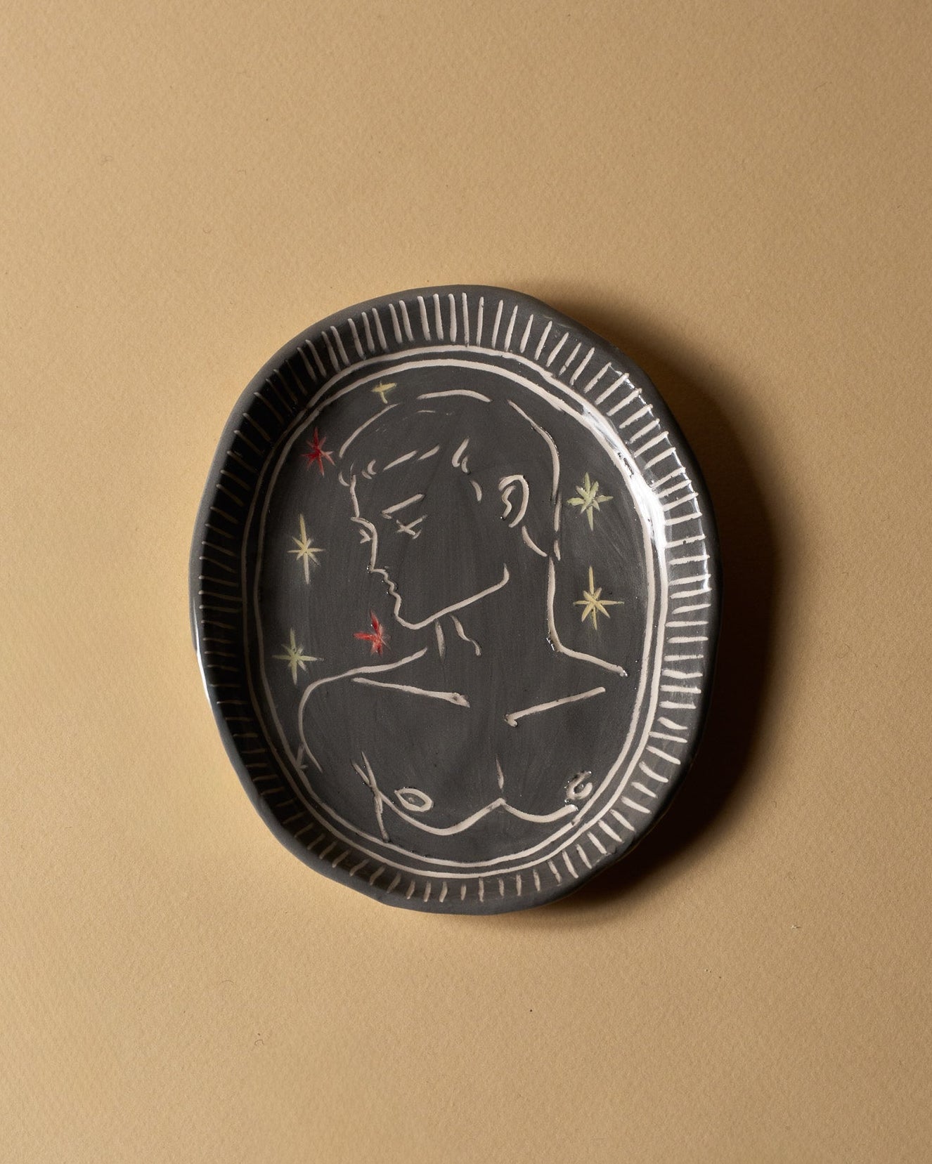 Vide-poche ovale en céramique émaillée bleu, décor incisé d'un profil masculin entouré d'étoiles stylisés. Pièce artisanale unique signée « Eldarov. T » au revers. Parfait état.