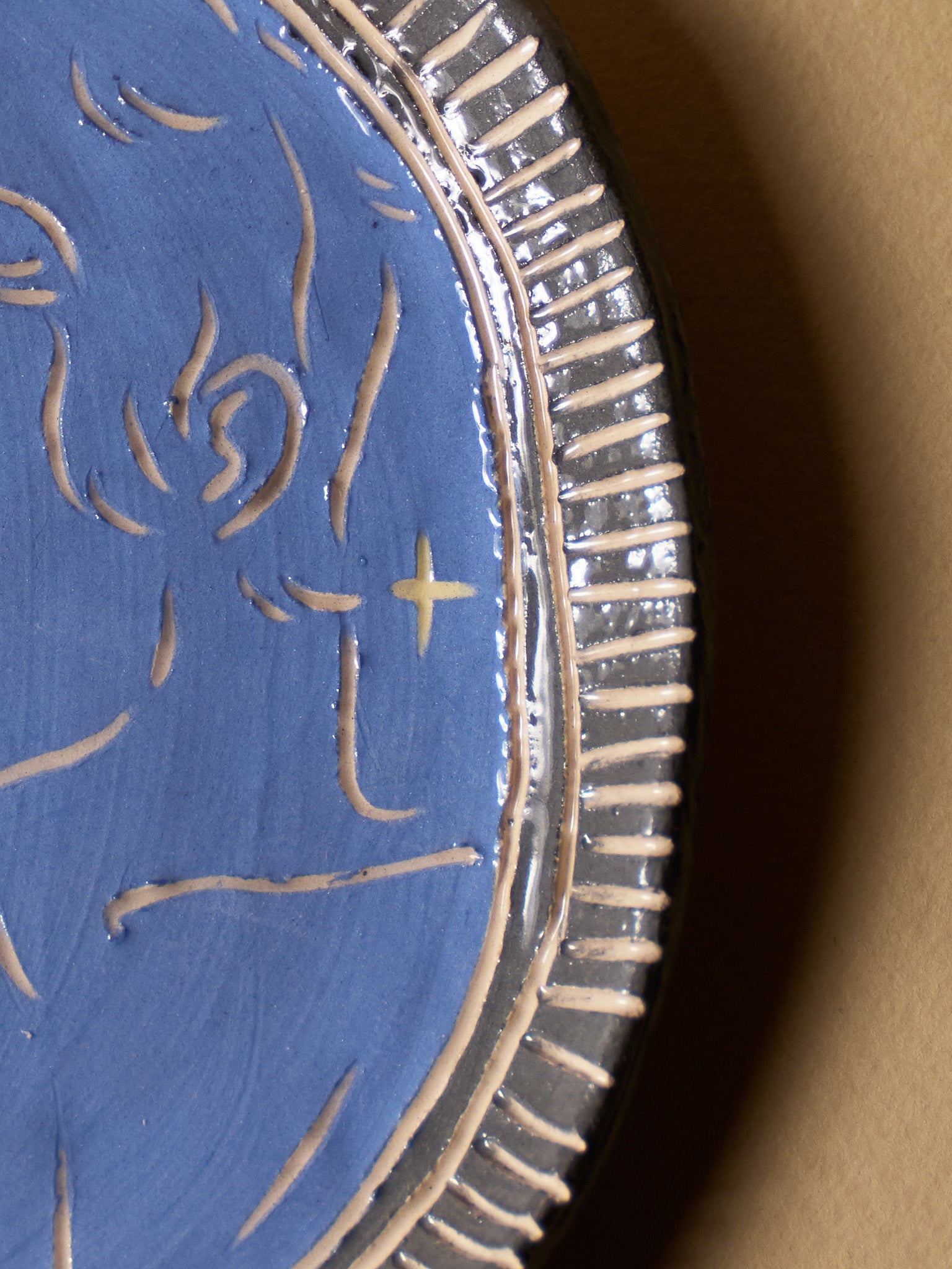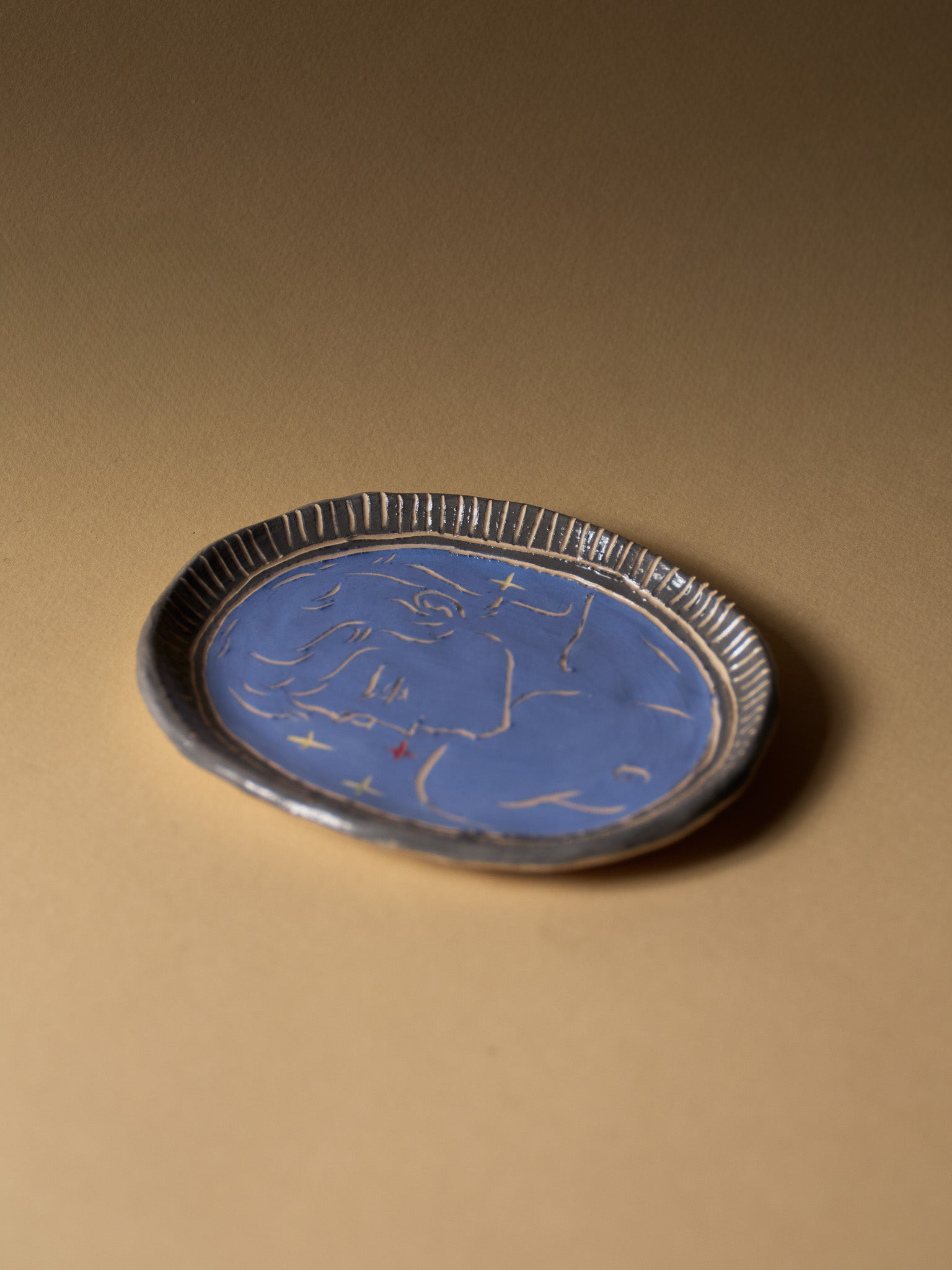 Vide-poche ovale en céramique émaillée bleu, décor incisé d'un profil masculin entouré d'étoiles stylisées, et d'un contour strié. Pièce artisanale unique signée « Eldarov. T » au revers. Parfait état.